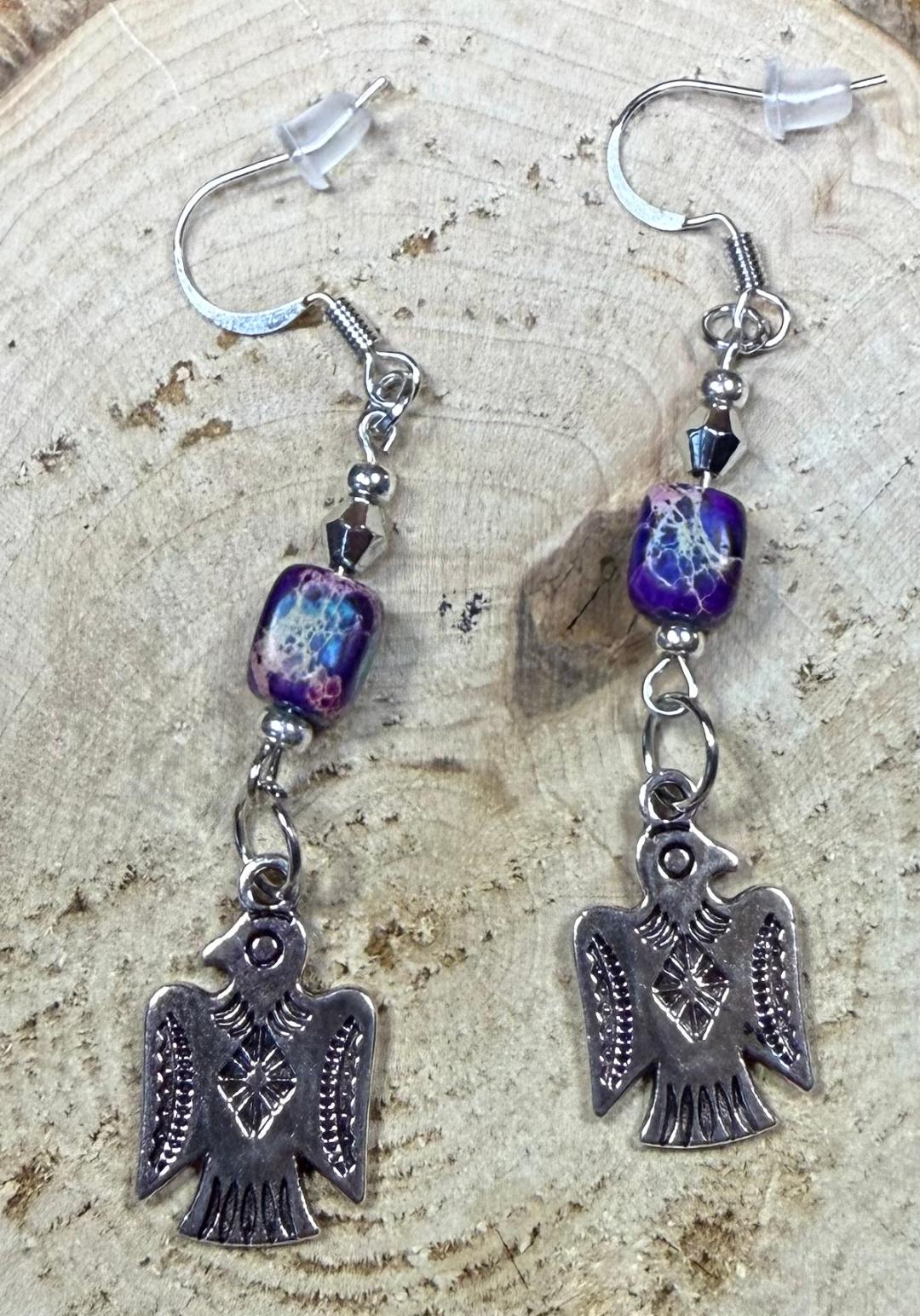 NEW SILVER THUNDERBIRD CHARM EARRINGS W/ CRACKLE FINISH JASPER BEAD