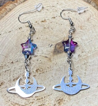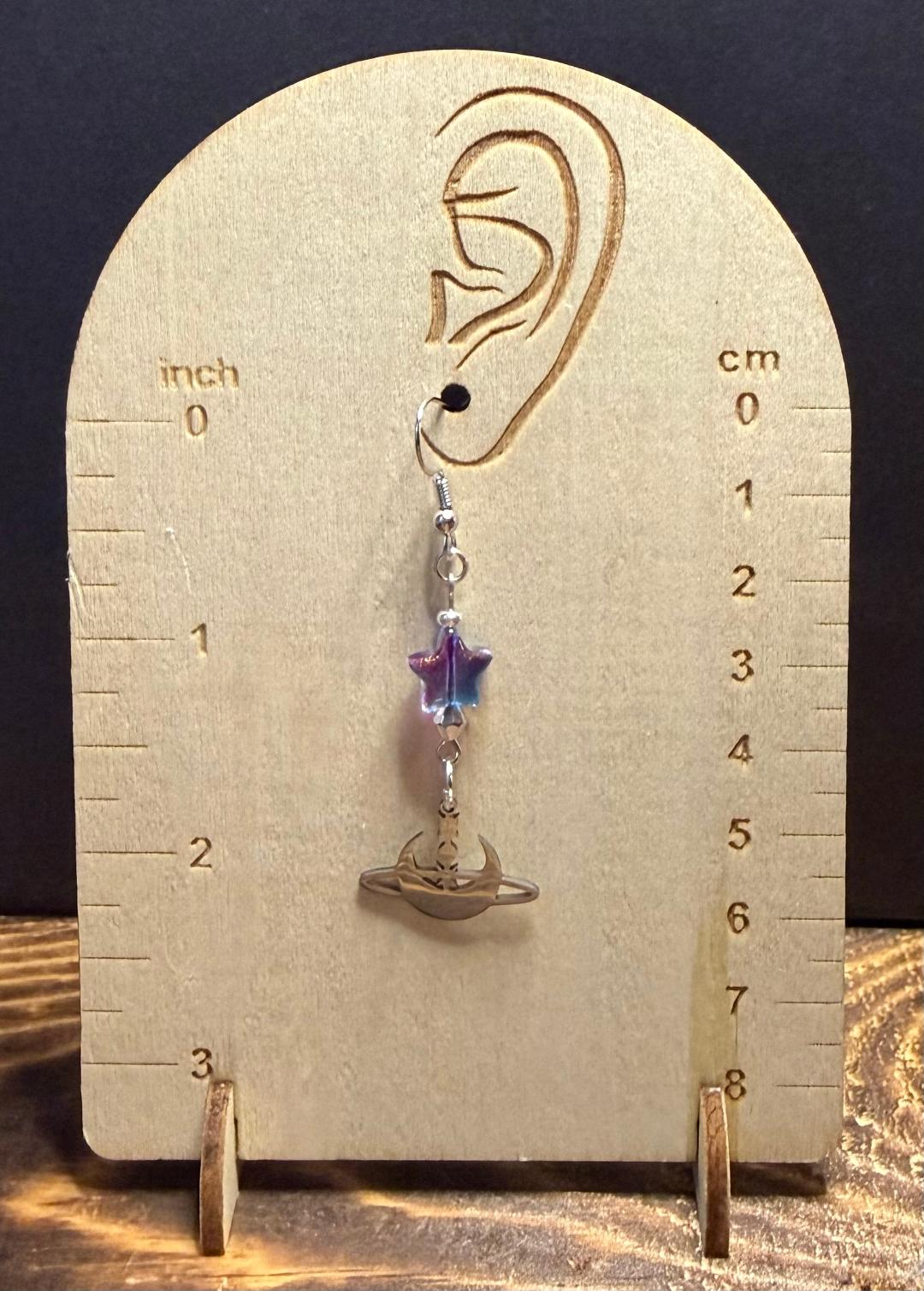 ![]() | Item #: 1006242 Click on image to see more pictures! A dainty silver stainless steel celestial charm featuring a crescent moon & stars. Topped with a plated glass blue/purple star bead that is dusted with gold metallic glitter. Made with nickel free earring hooks. Measurement Questions? Price: 18.00 |