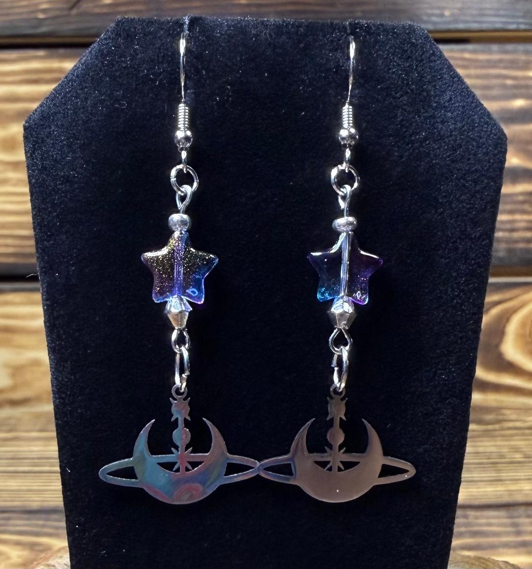 NEW STAINLESS STEEL CELESTIAL MOON & STARS EARRINGS W/ GLASS STAR BEADS