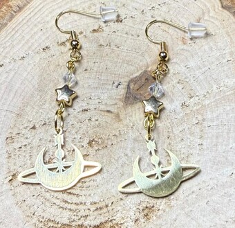 ![]() | Item #: 1006243 Click on image to see more pictures! A dainty gold stainless steel celestial charm featuring a crescent moon & stars. Topped with a faceted clear glass bead, as well as a small gold star bead. Made with 18K gold plated, nickel free earring hooks. Measurement Questions? Price: 18.00 |