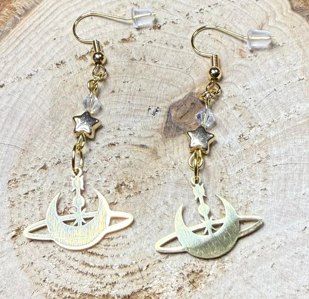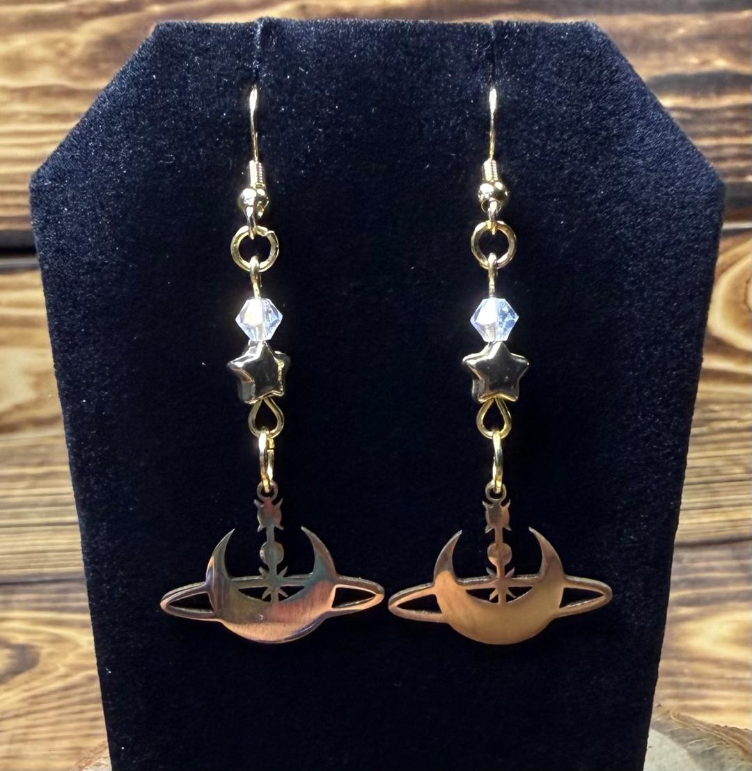 NEW GOLD STAINLESS STEEL CELESTIAL MOON & STARS EARRINGS W/ GLASS & STAR BEADS