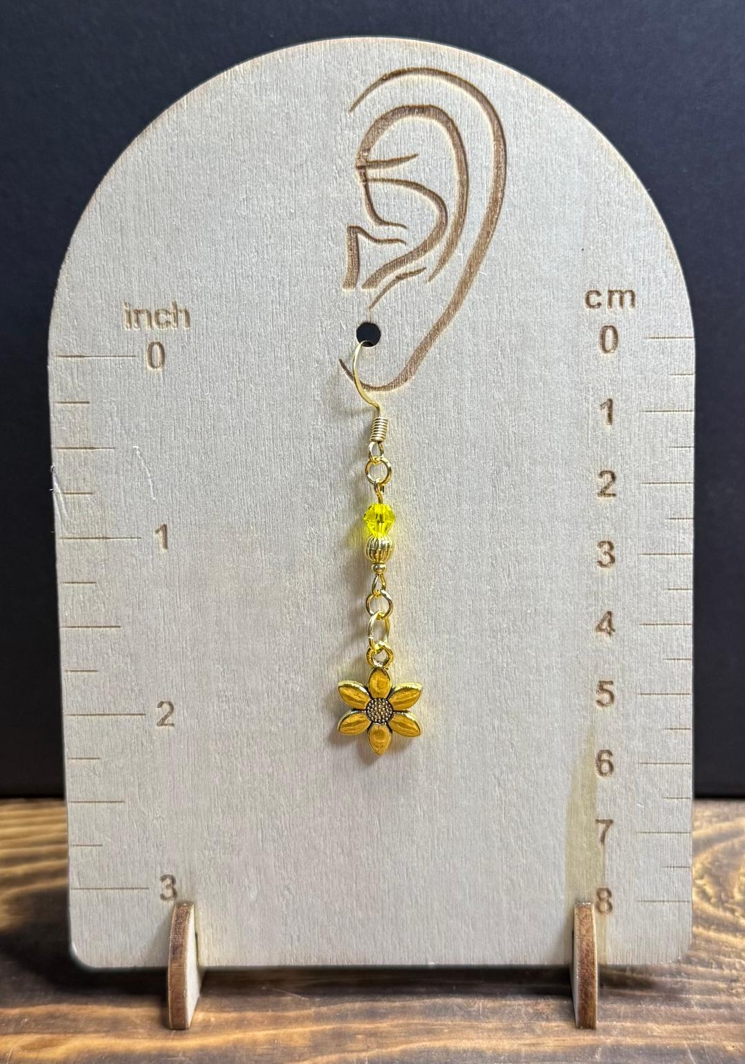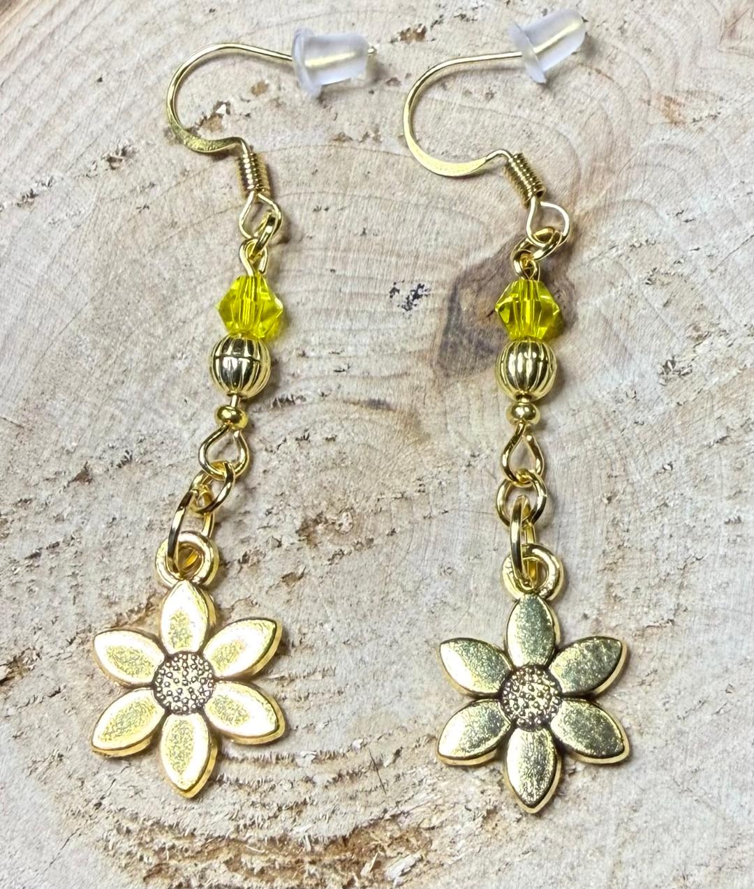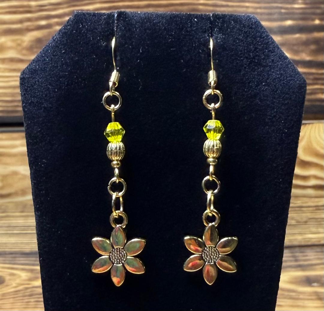NEW DOUBLE SIDED GOLD FLOWER CHARM EARRINGS W/ YELLOW GLASS BEADS