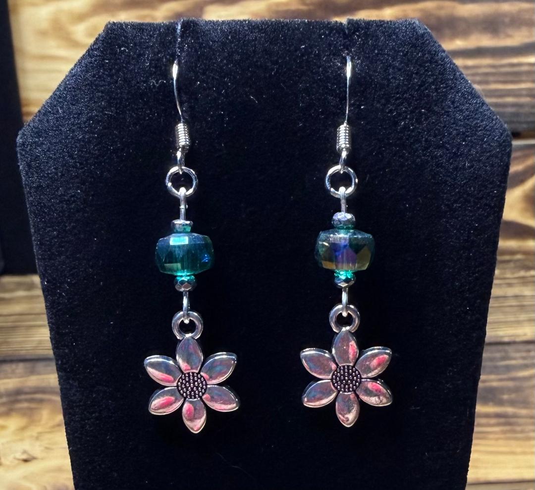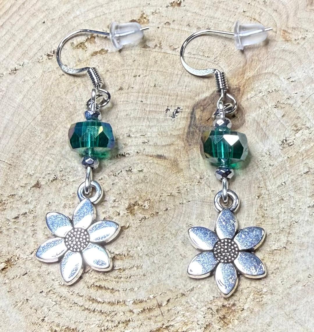 NEW DOUBLE SIDED SILVER FLOWER CHARM EARRINGS W/ FOREST GREEN GLASS BEADS