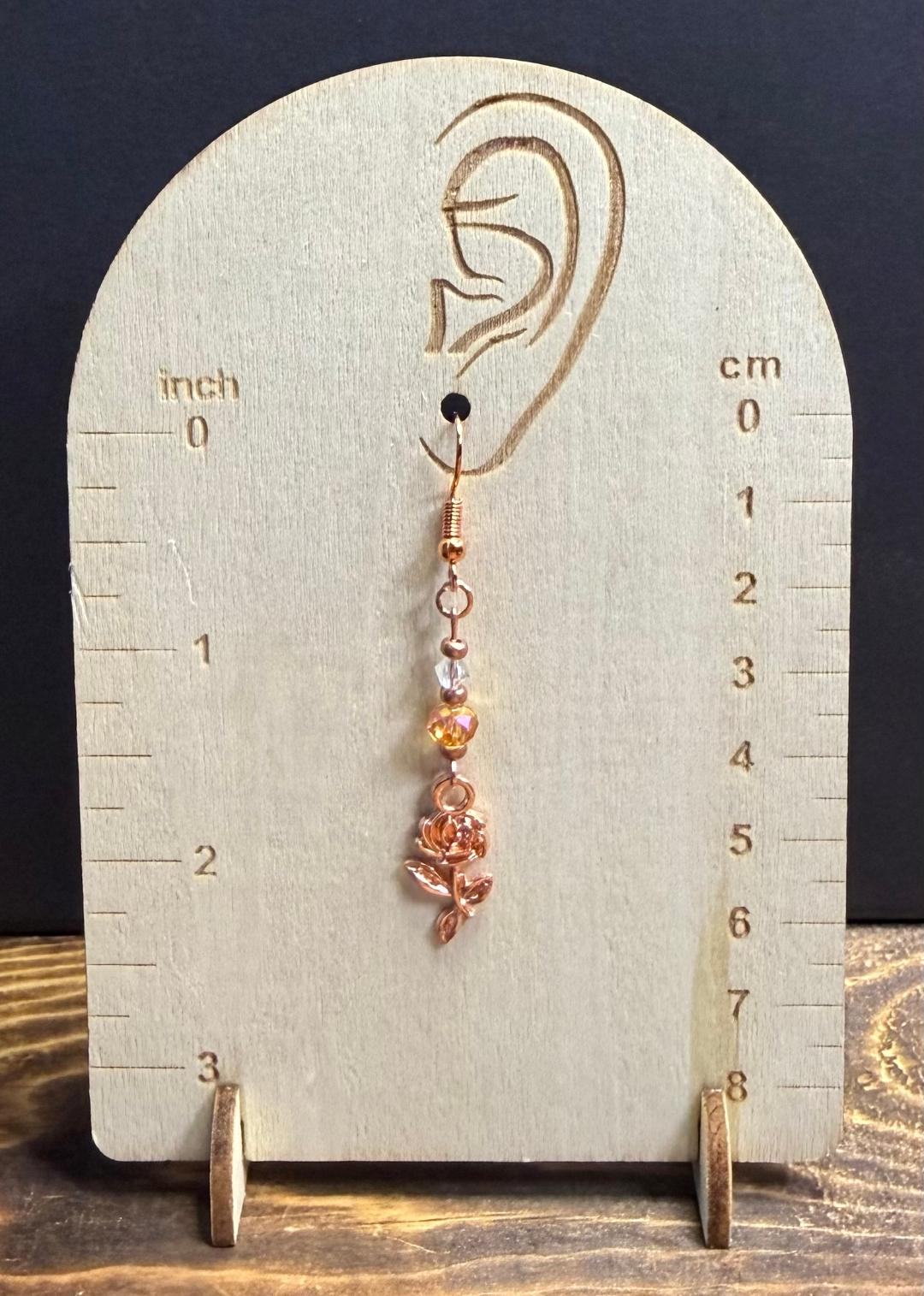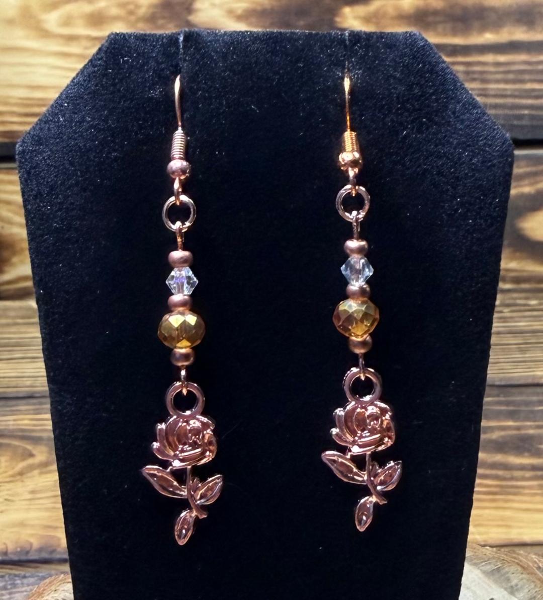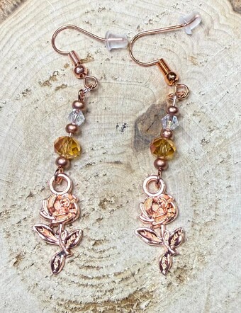 ![]() | Item #: 1006250 Click on image to see more pictures! A detailed single rose charm pair of earrings, color is vibrant rose gold. They are topped with amber & clear glass faceted beads, as well as small Czech glass, matching rose gold seed beads. Made with rose gold nickel free earring hooks. Measurement Questions? Price: 20.00 |
