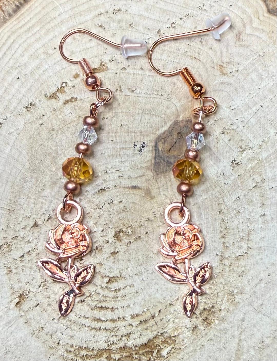 NEW ROSE GOLD FLOWER EARRINGS W/ AMBER & CLEAR GLASS BEADS