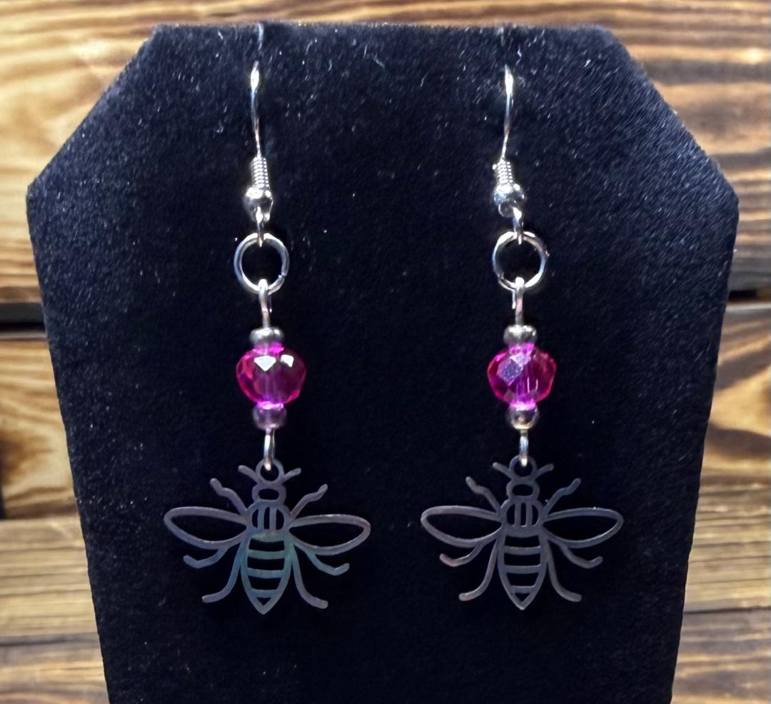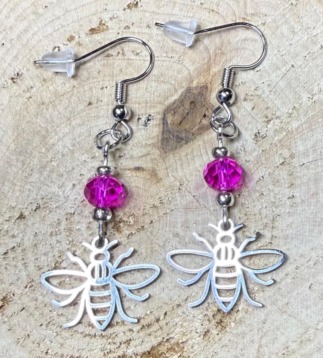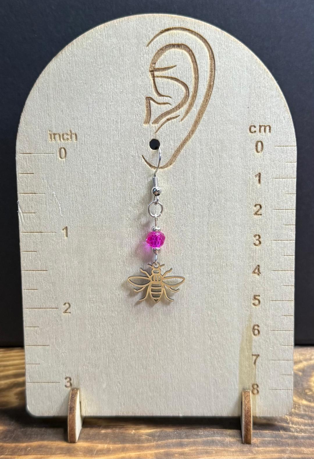 NEW SILVER STAINLESS STEEL HOLLOW BEE CHARM EARRINGS W/ HOT PINK BEAD