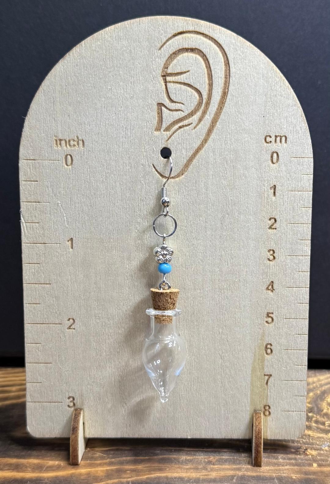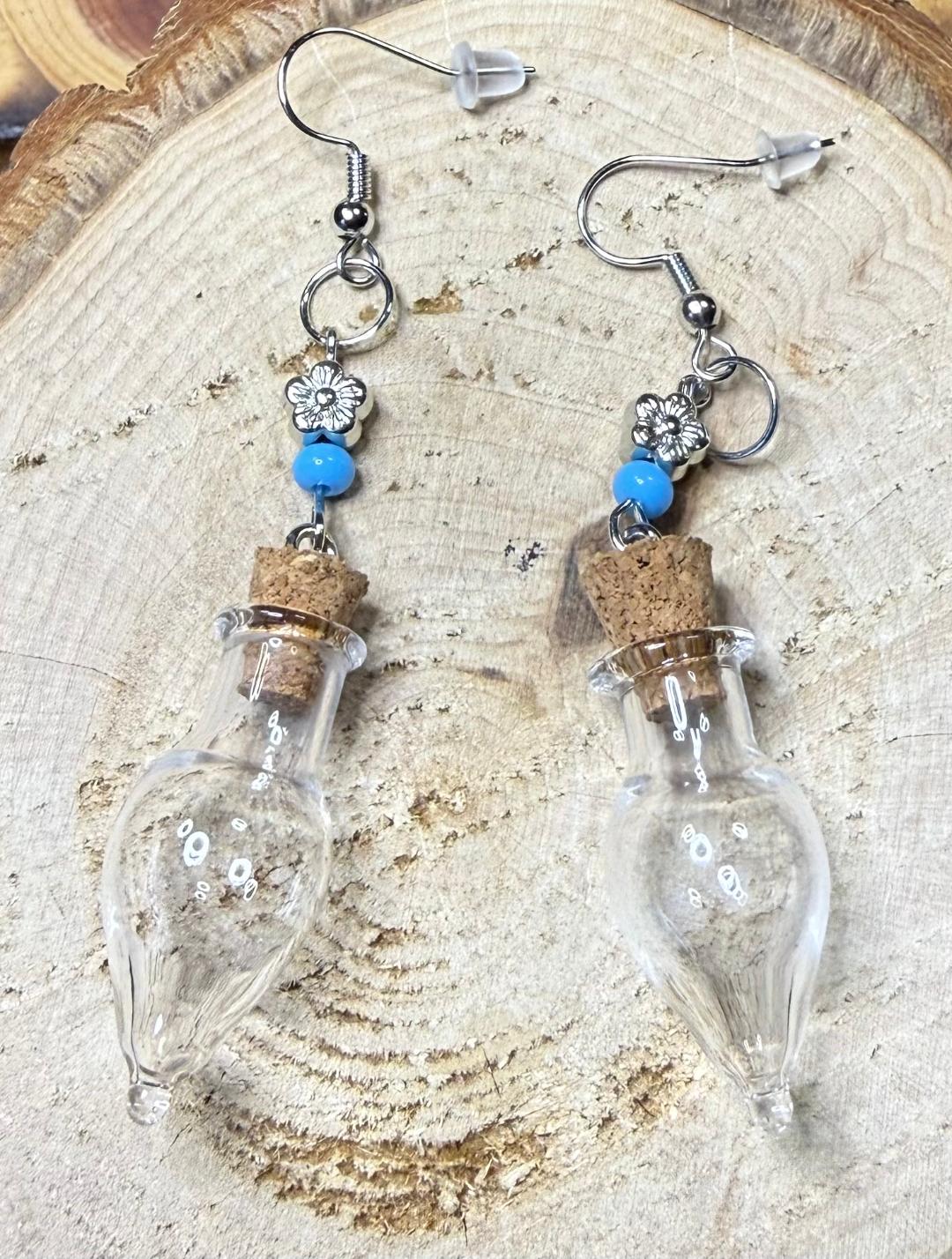 NEW CLEAR GLASS BOTTLE EARRINGS W/ FLOWER & BLUE BEADS
