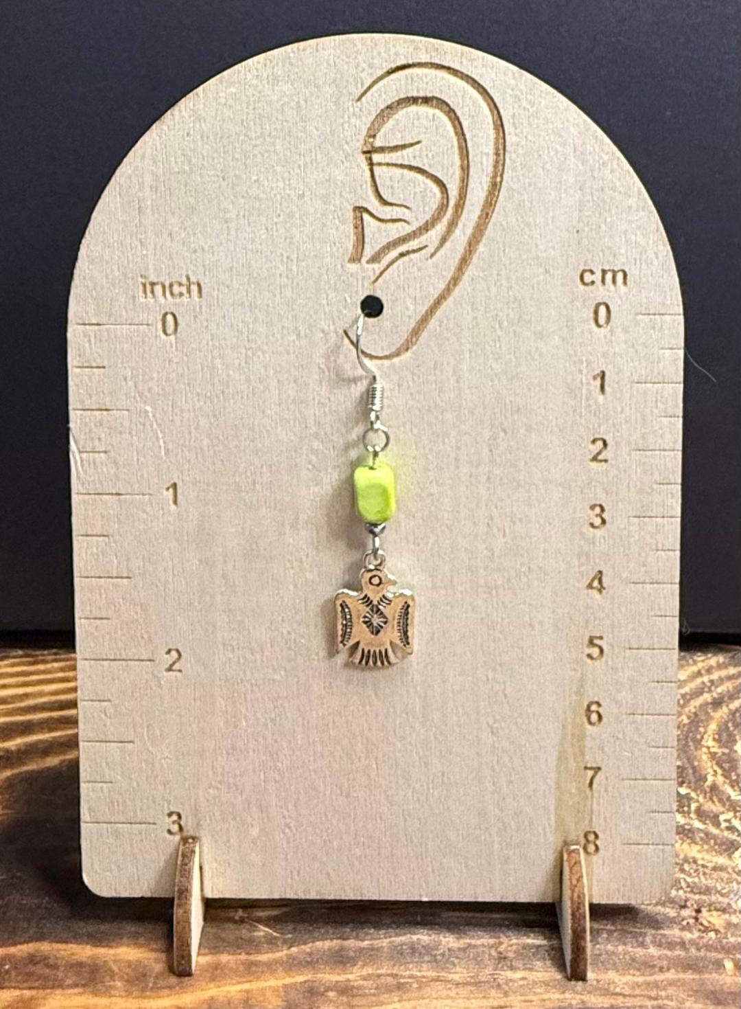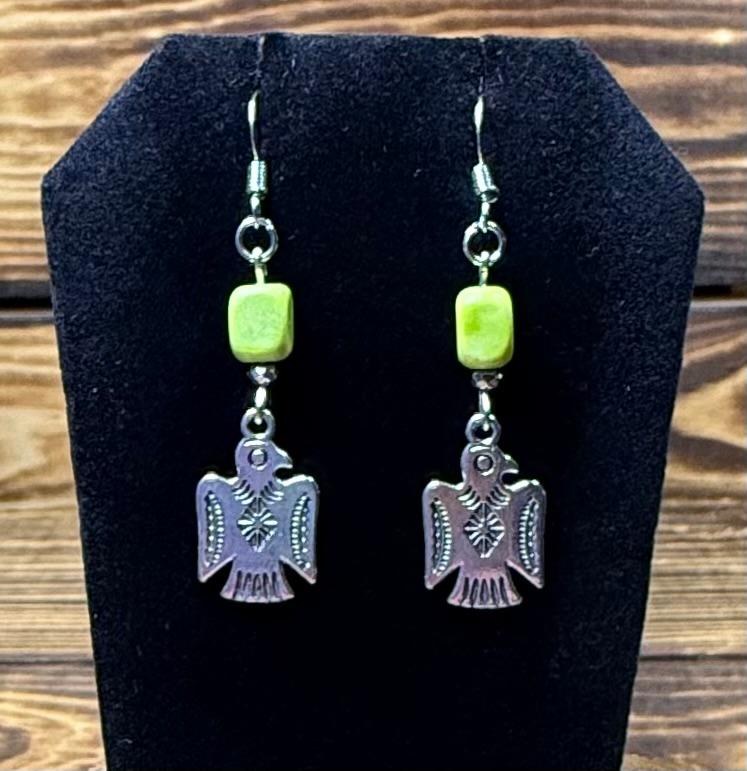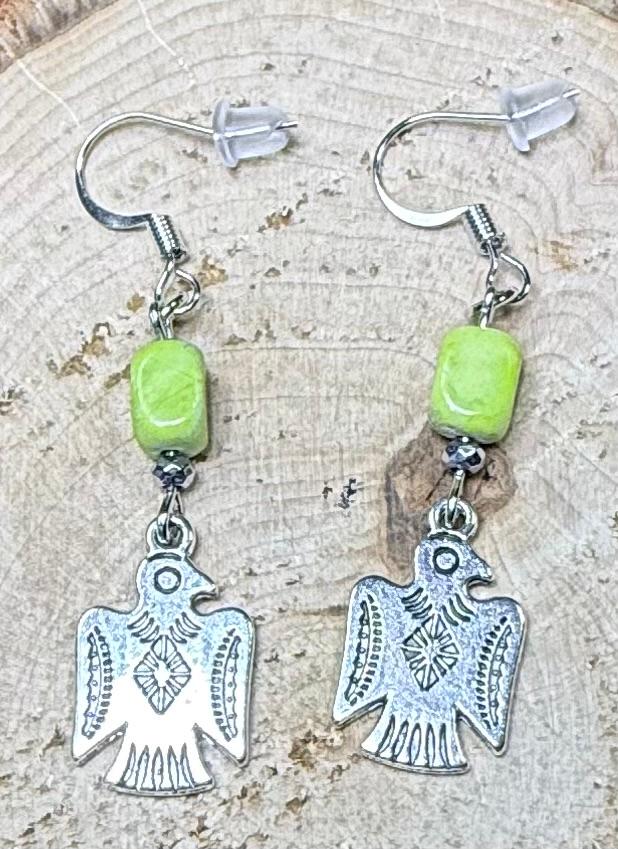 NEW SILVER THUNDERBIRD CHARM EARRINGS W/ BRIGHT GREEN JASPER BEAD