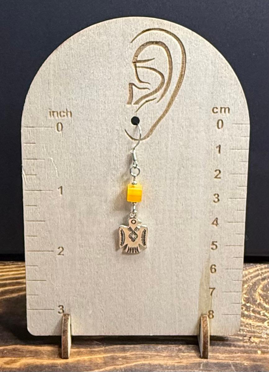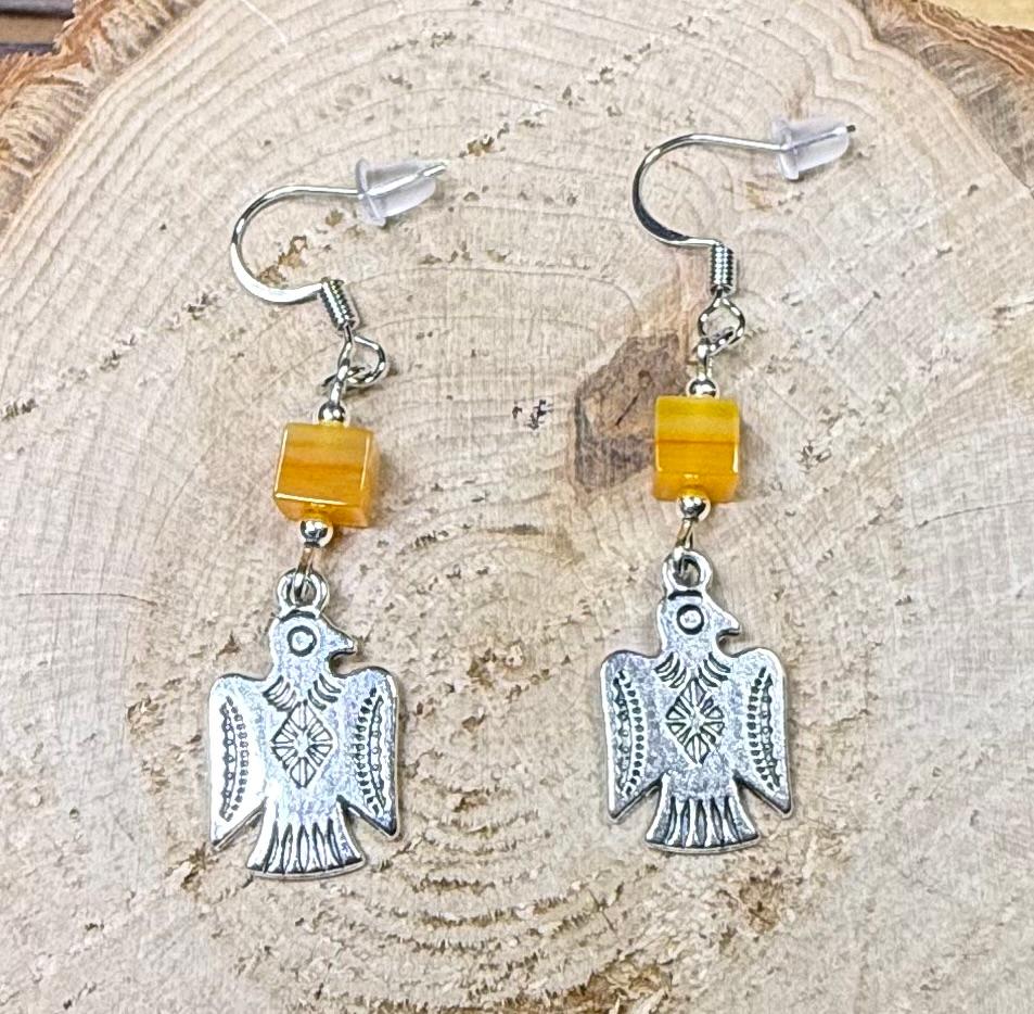 NEW SILVER THUNDERBIRD CHARM EARRINGS W/ SQUARE ORANGE GLASS BEAD