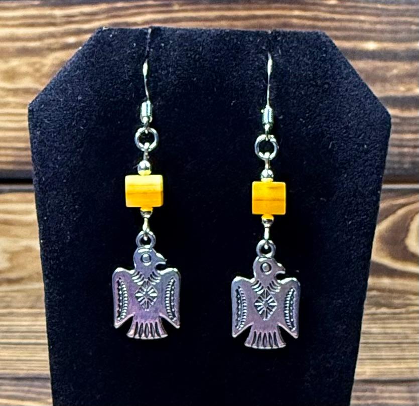 ![]() | Item #: 1006268 Click on image to see more pictures! A wonderful Southwestern style pair of earrings with a silver etched metal alloy thunderbird charm. They are topped with a square glass orange bead. Made with nickel free earring hooks. Measurement Questions? Price: 17.00 |