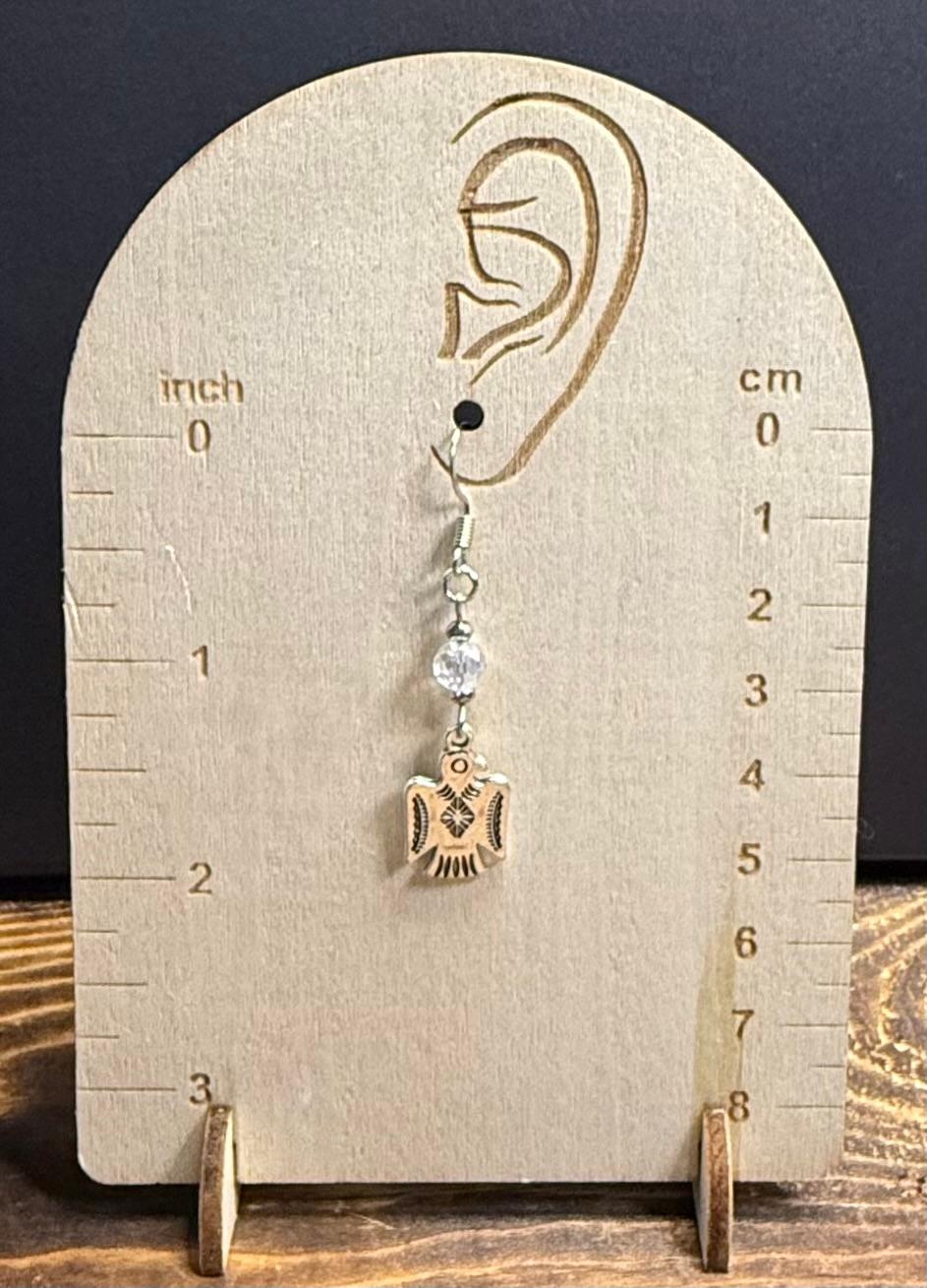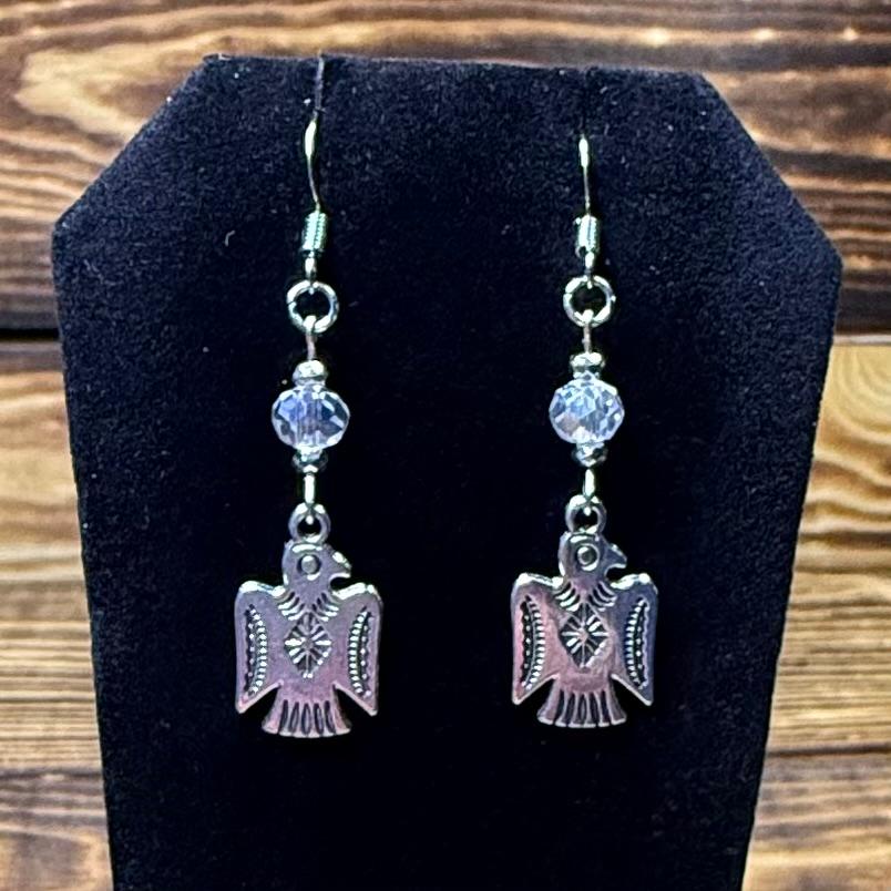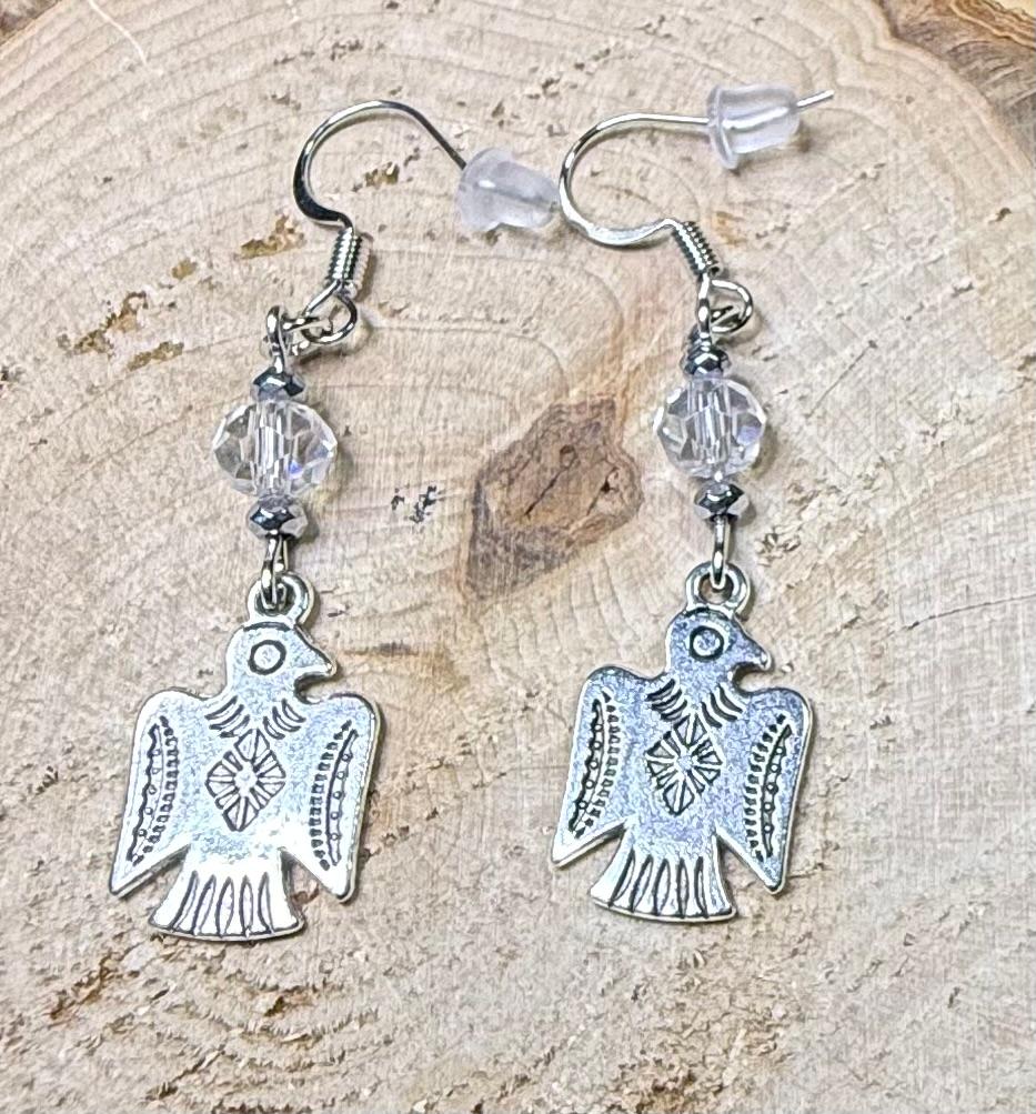 NEW SILVER THUNDERBIRD CHARM EARRINGS W/ CLEAR FACETED GLASS BEAD