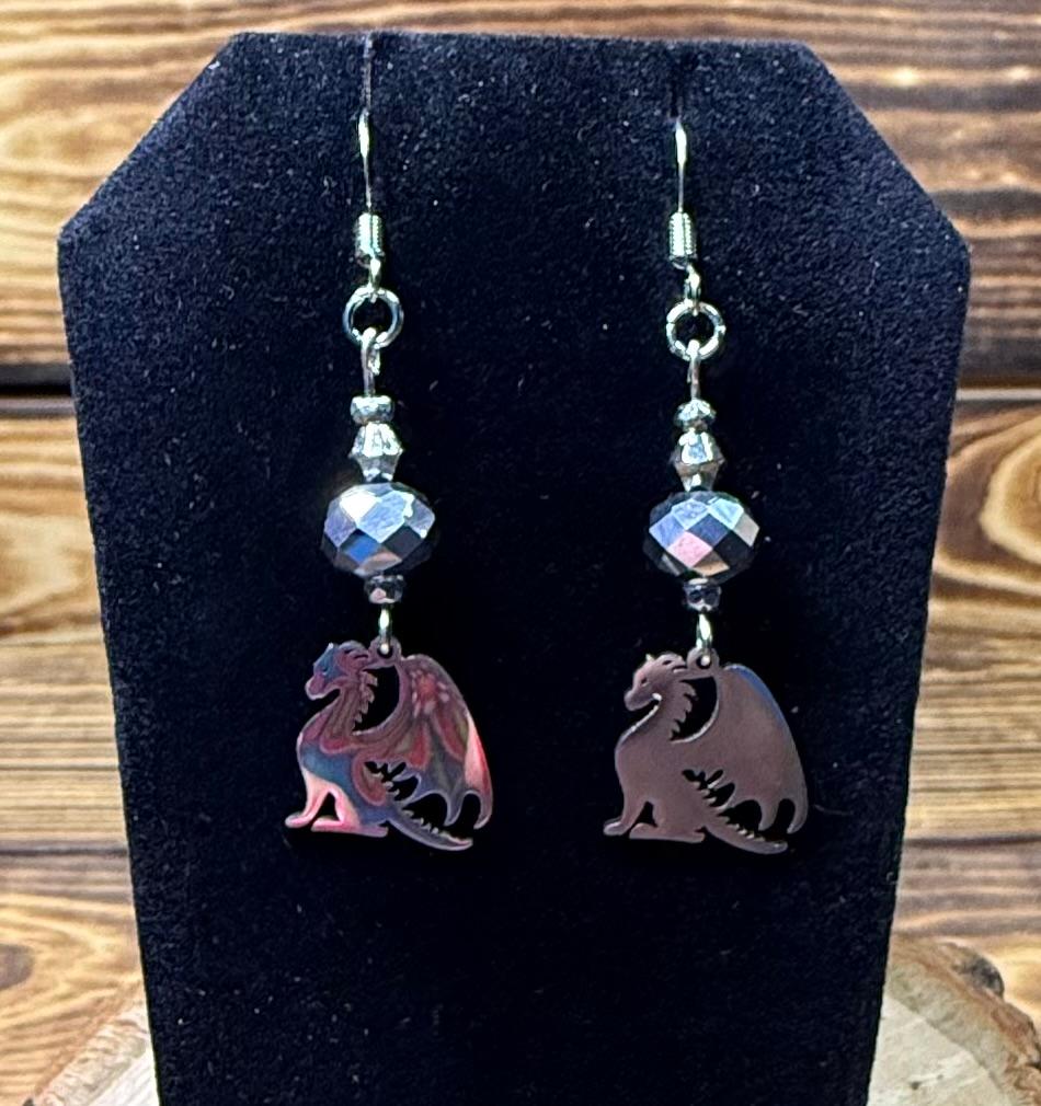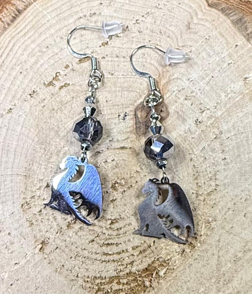 NEW STAINLESS STEEL DRAGON CHARM EARRINGS W/ PLATED GLASS GRAY BEADS