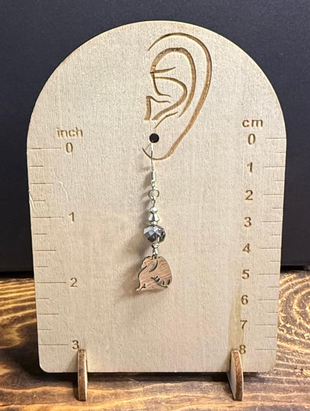 ![]() | Item #: 1006276 Click on image to see more pictures! These unique & dramatic earrings have a small stainless steel charm in the shape of a dragon as the focal point. Topped with a lovely plated glass faceted gray bead and small silver faceted spacer beads. Made with nickel free earring hooks. Measurement Questions? Price: 20.00 |