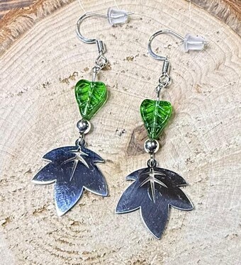 ![]() | Item #: 1006277 Click on image to see more pictures! A wonderful pair of stainless steel charm earrings in the shape of a maple leaf. They are topped with etched green glass leaf beads. Made with nickel free earring hooks. Measurement Questions? Price: 18.00 |