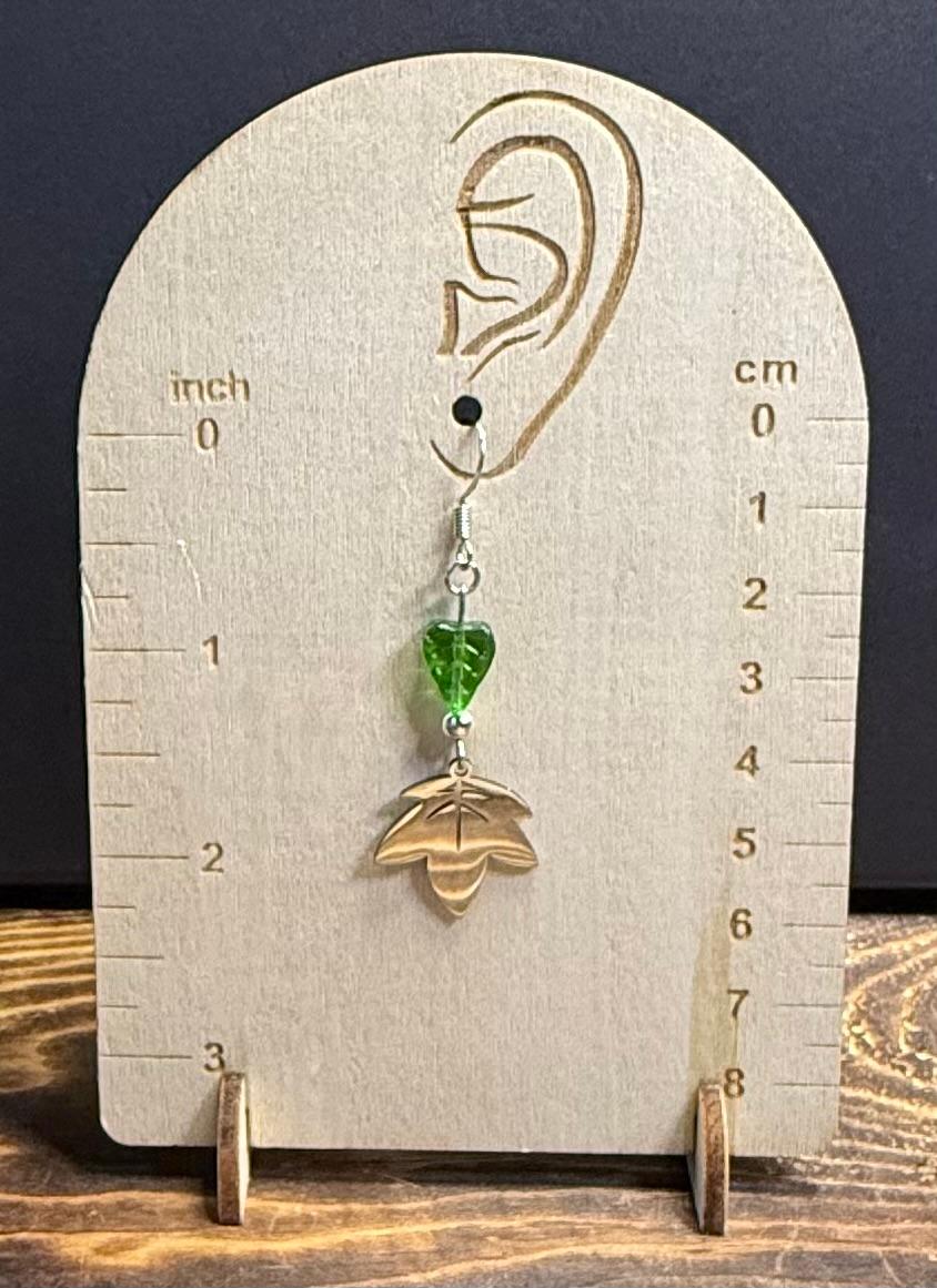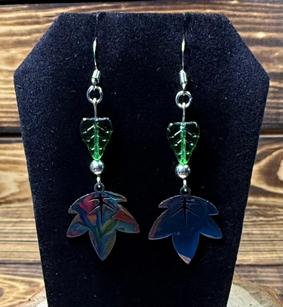 NEW STAINLESS STEEL MAPLE LEAF EARRINGS W/ GREEN GLASS LEAF BEADS