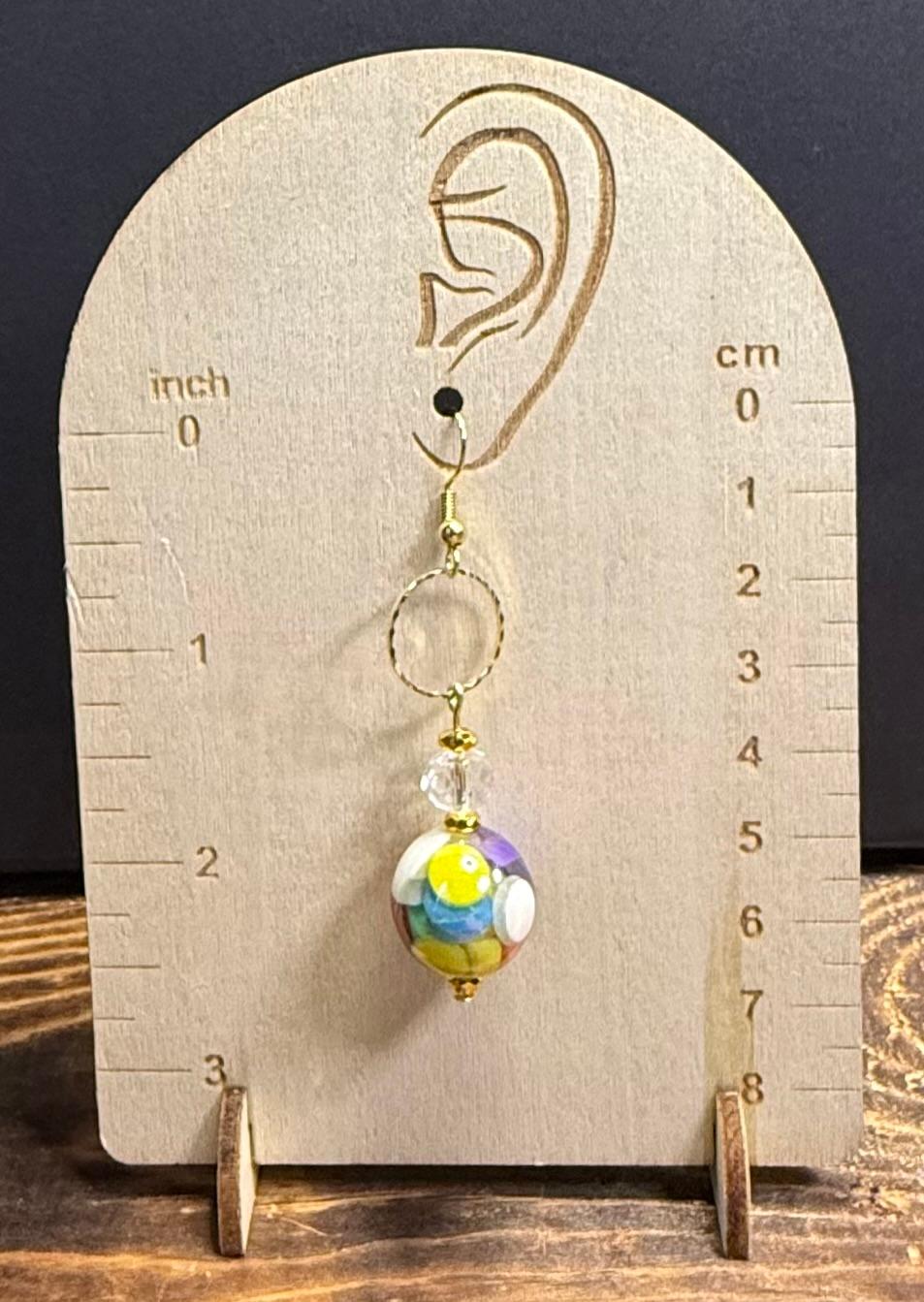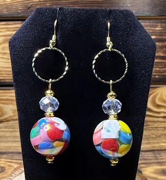 ![]() | Item #: 1006279 Click on image to see more pictures! A colorful pair of mod style earrings with the focal point being a larger size plated acrylic ball charm. There are also gold hematite seed beads, clear glass faceted bead, and topped with a large & sparkly gold colored etched jump ring. Made with 18K gold plated, nickel free earring hooks. Measurement Questions? Price: 19.00 |
