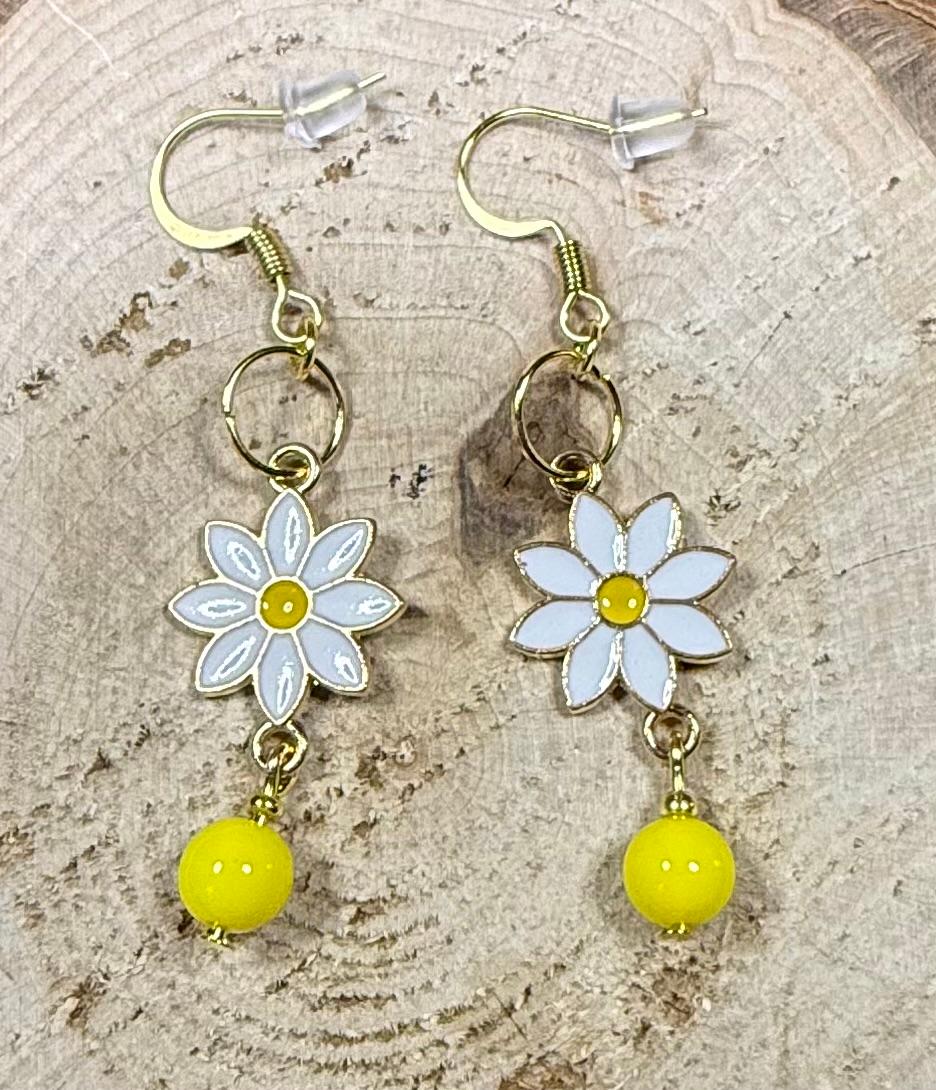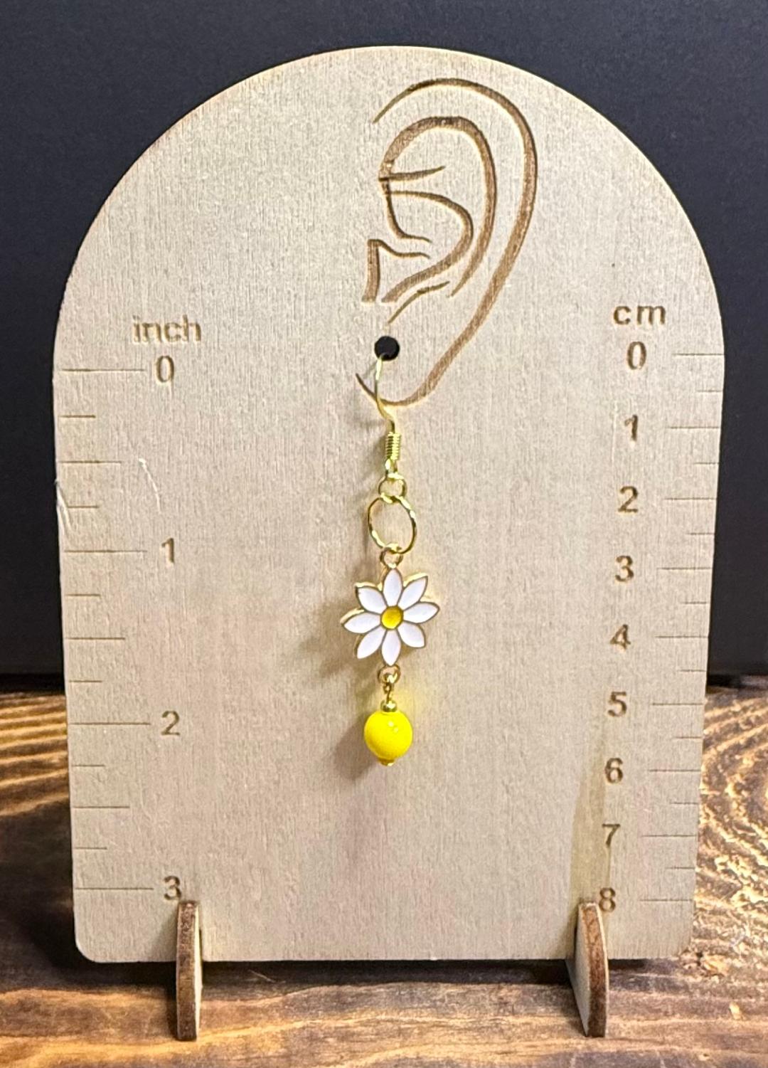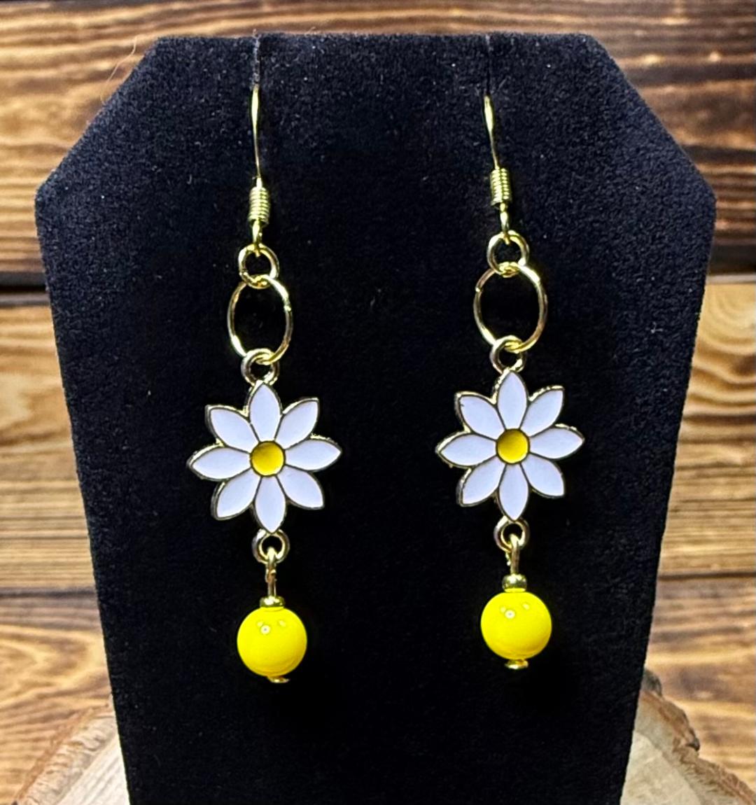 NEW WHITE DAISY CHARM EARRINGS W/ YELLOW BEADS