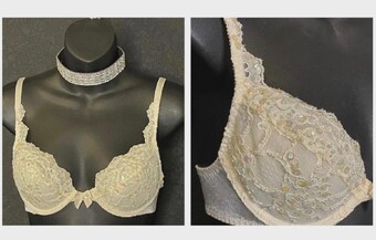 ![]() | Item #: 1006288 Click on image to see more pictures! Made by Victoria's Secret, circa likely 1990's but possible 1980's. This comes from my own personal lingerie drawer, I saved it for years and never did get a chance to wear it. It's so glamorous and focused on upscale! It seems to be a rare style, tag reads number 76217. The cups are heavily beaded with faux seed pearls and sequins, as well as a lace overlay that is scalloped around the edging. There is underwire, the cups are also padded. As you can see, the extra pads can be removed if you like. It is in wonderful condition! A great gift for someone special or a treat for yourself! Size is 34B. Measurement Questions? Price: 75.00 |
