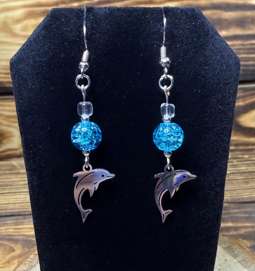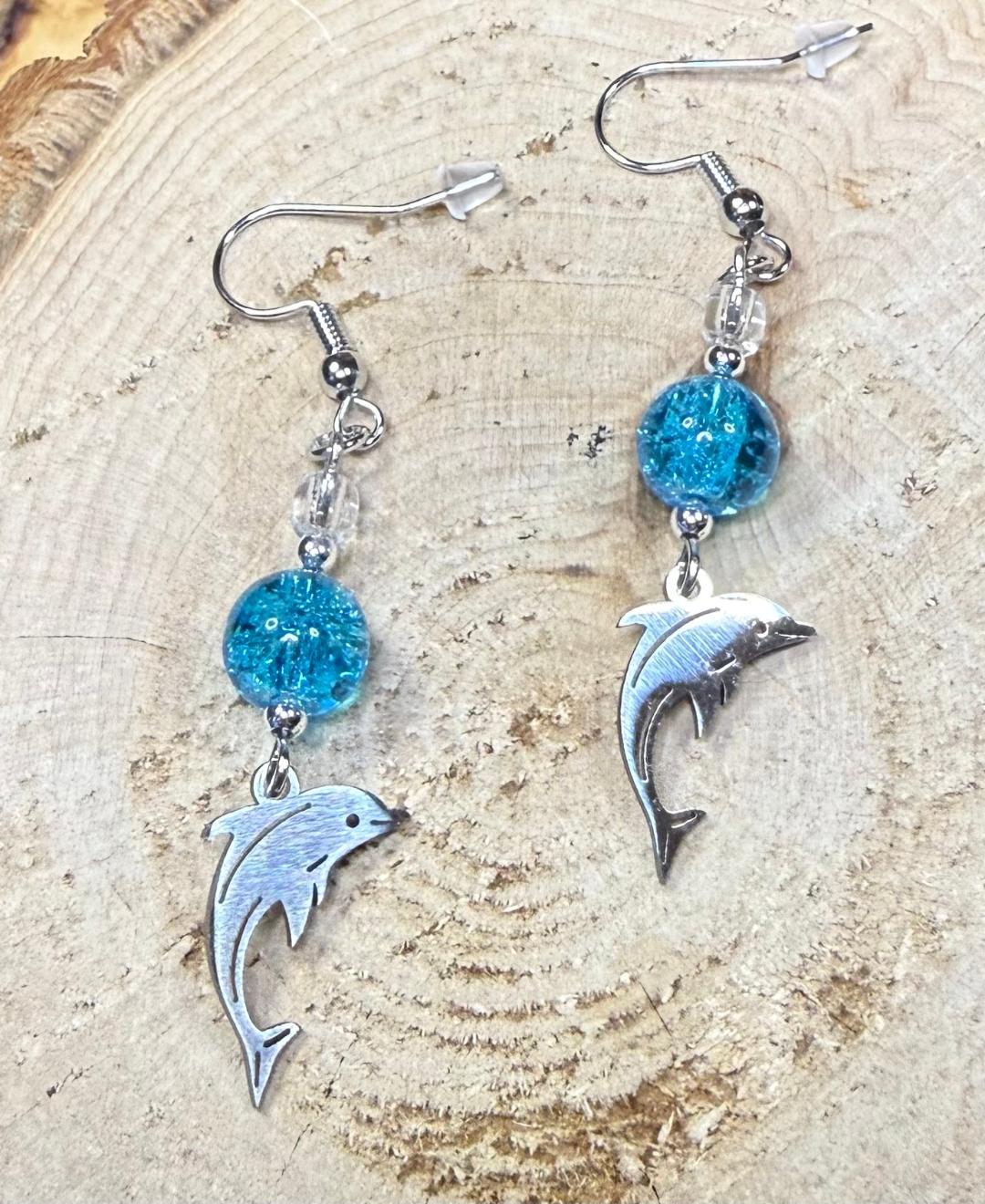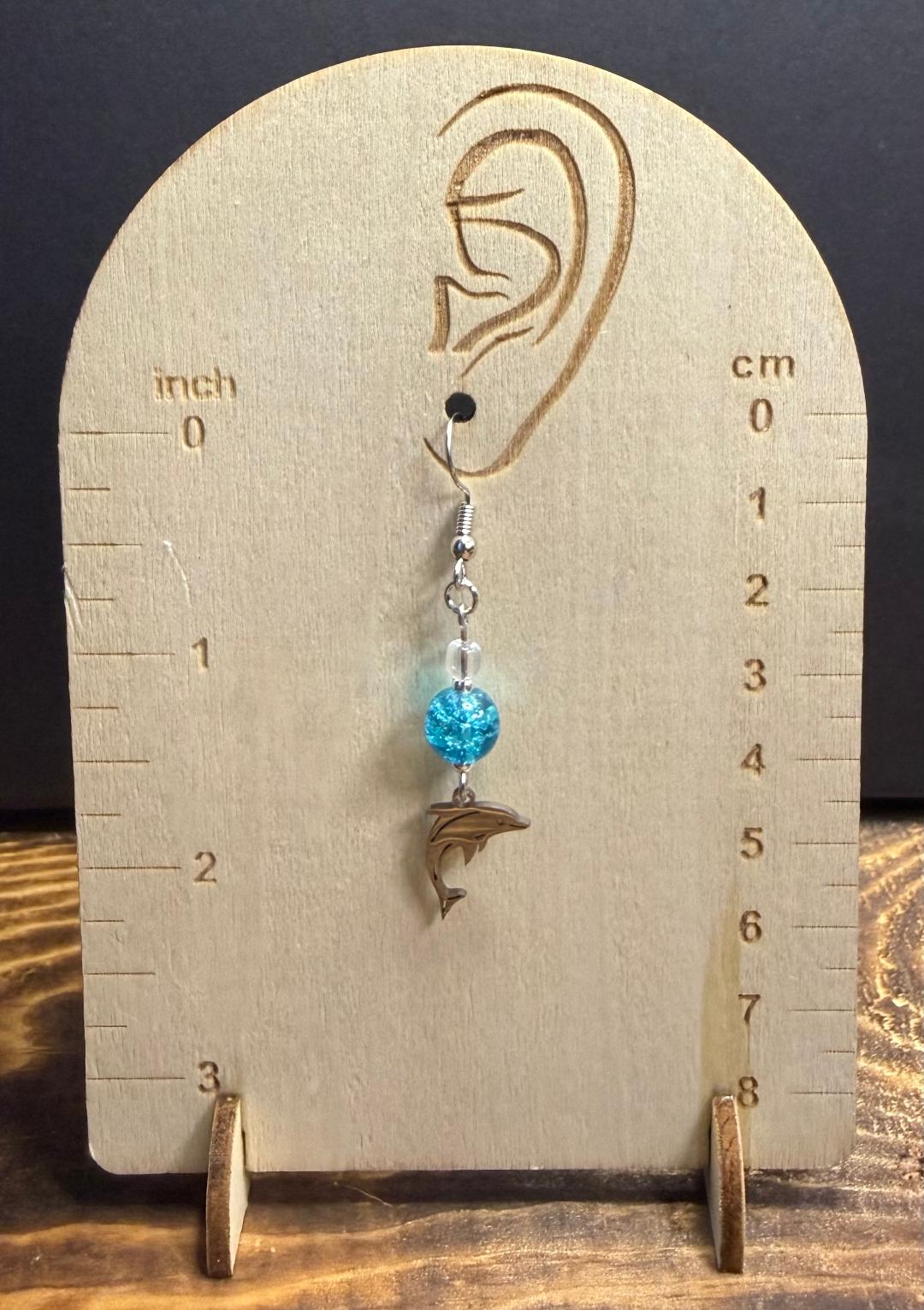 NEW SILVER STAINLESS STEEL DOLPHIN CHARM EARRINGS W/ AQUA BLUE GLASS BEADS