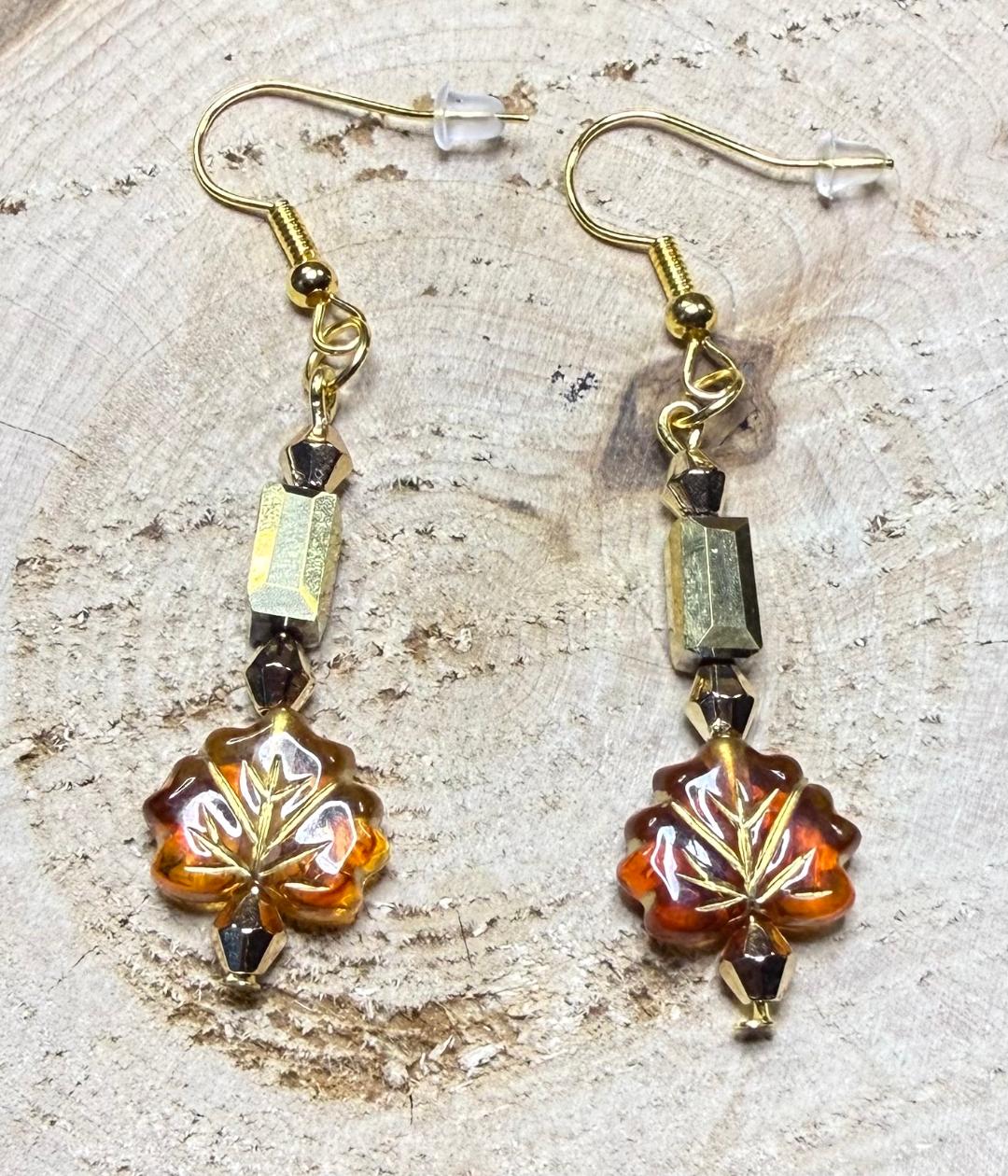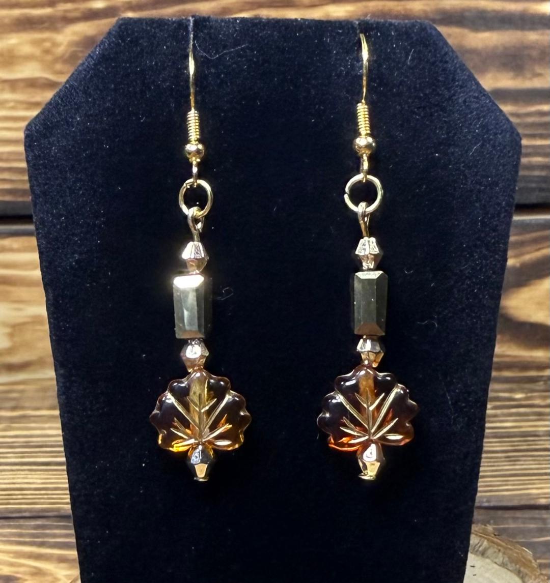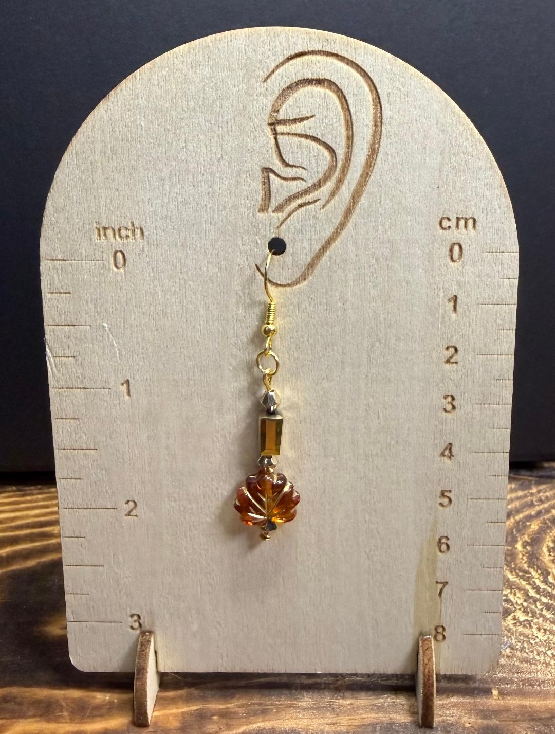 NEW AMBER LEAF CHARM EARRINGS W/ GLASS RECTANGLE BEADS