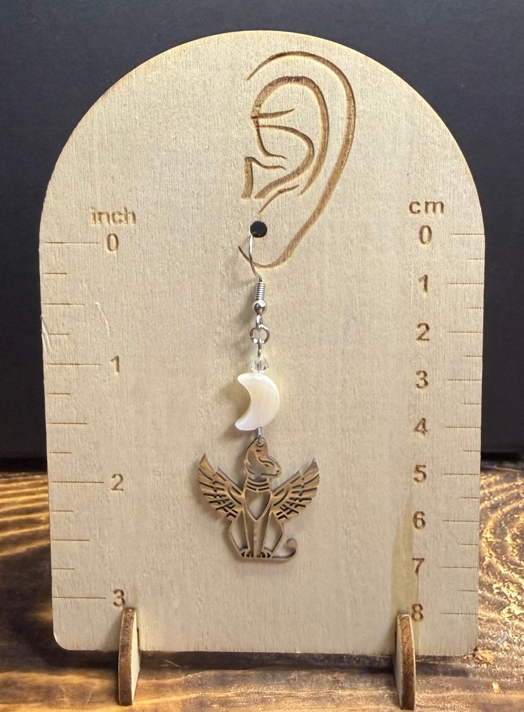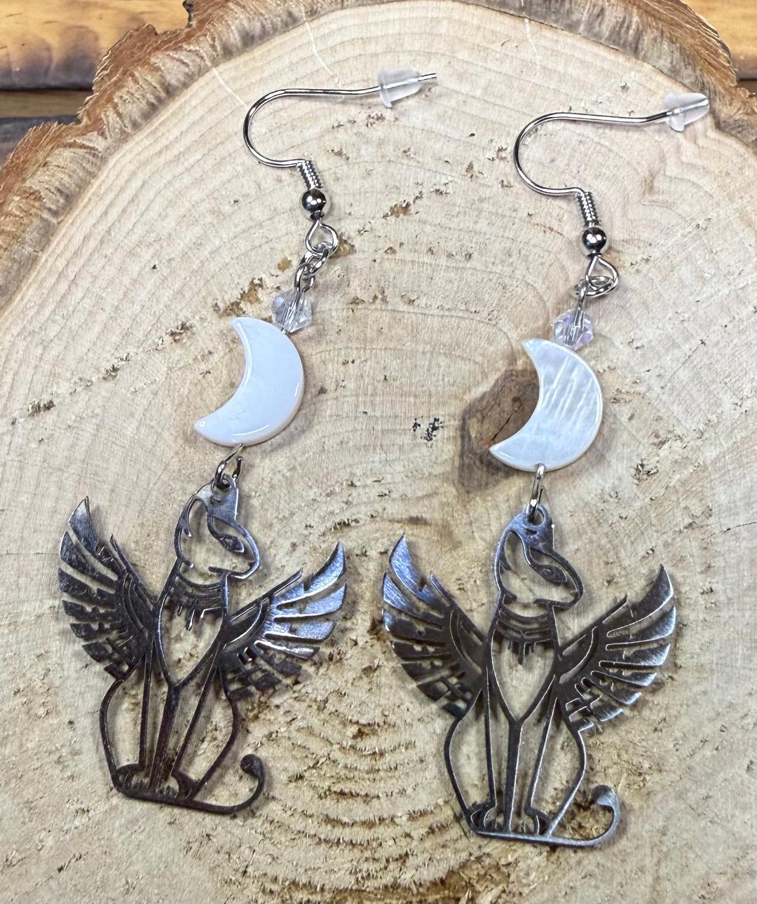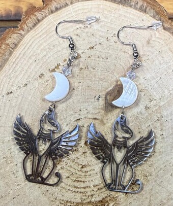 ![]() | Item #: 1006302 Click on image to see more pictures! Dramatic silver stainless steel earrings featuring Bastet, the Egyptian winged cat. Topped with a smooth and shiny, real shell moon charm, as well as a faceted glass clear bead. Made with nickel free earring hooks. Measurement Questions? Price: 21.00 |