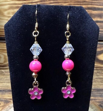 ![]() | Item #: 1006304 Click on image to see more pictures! A dainty little pink enamel front flower charm, pink round bead, clear faceted glass bead. Made with 18K plated, nickel free earring hooks. Measurement Questions? Price: 16.00 |