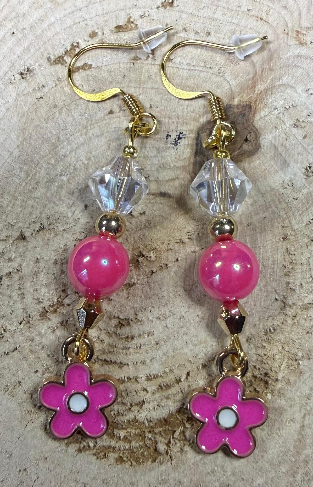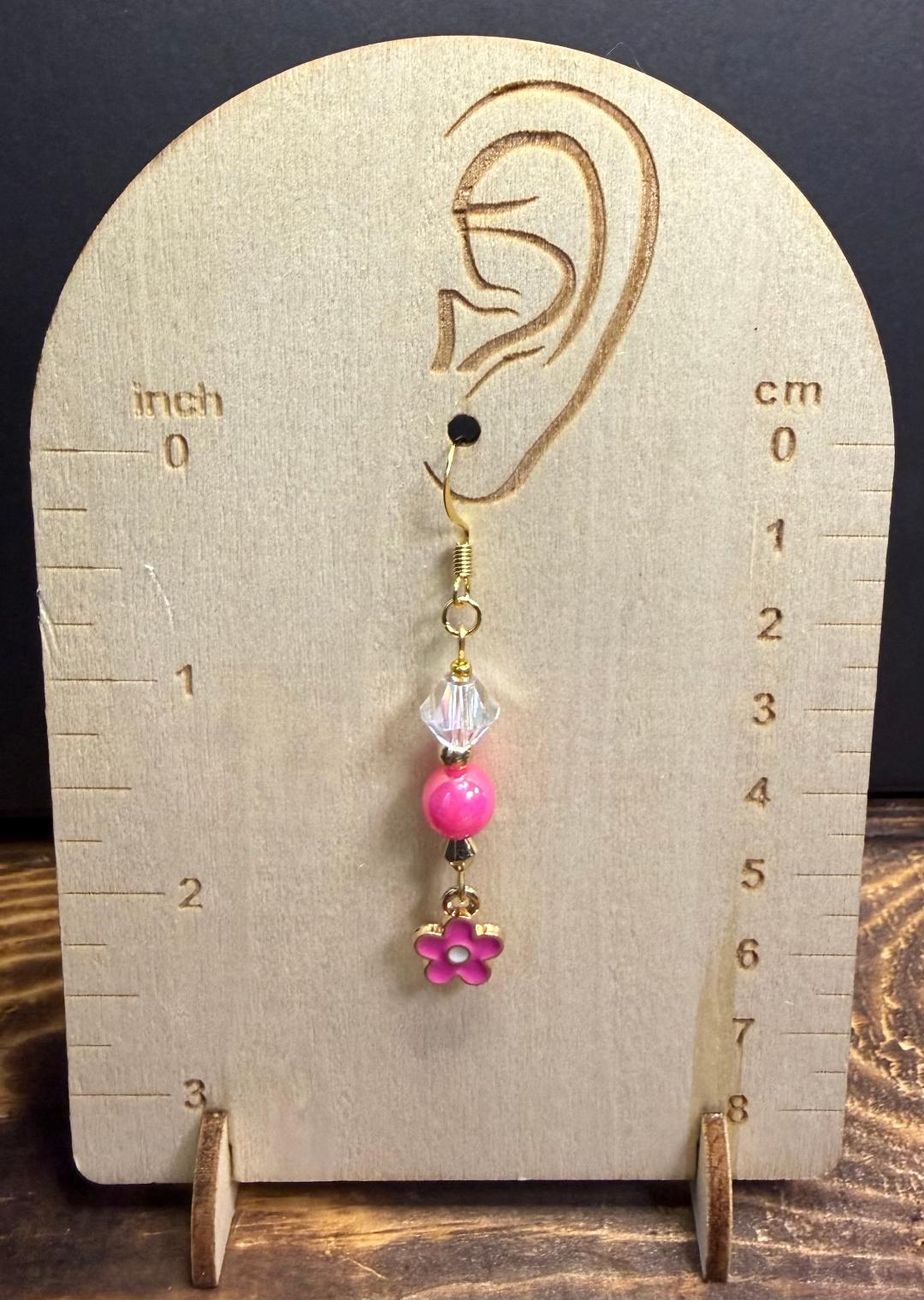NEW TINY PINK FLOWER CHARM BOHO HIPPIE EARRINGS W/ BEADS