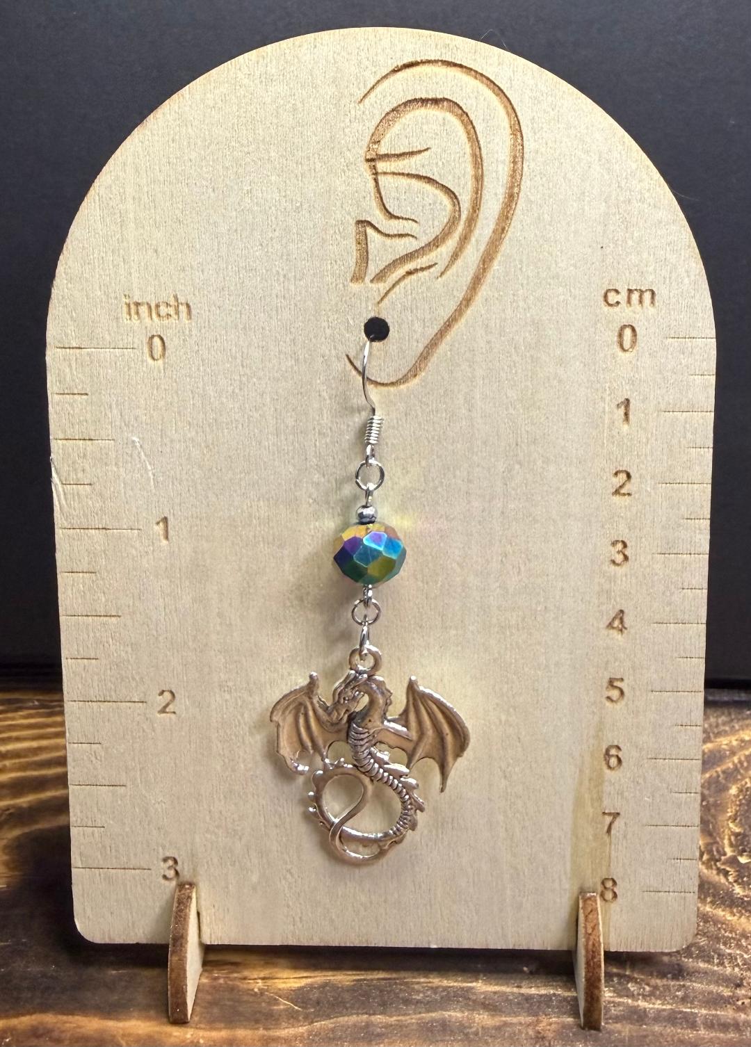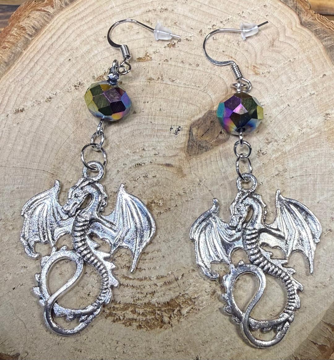 NEW LARGE GOTH DRAGON EARRINGS W/ IRIDESCENT RAINBOW GLASS BEAD