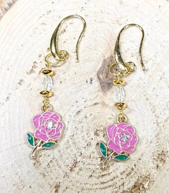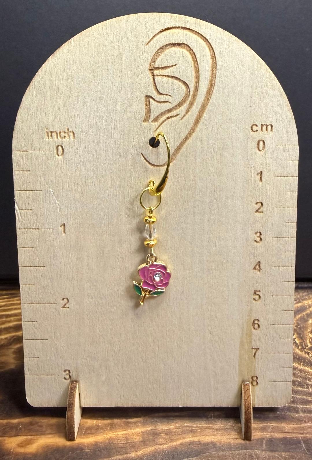 NEW SINGLE PINK ENAMEL ROSE EARRINGS W/ RHINESTONE CENTER