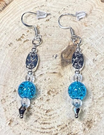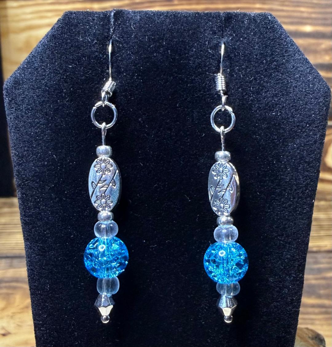 ![]() | Item #: 1006318 Click on image to see more pictures! Vividly colored aqua blue glass beads with round clear glass beads, as well as etched oval floral beads. Made with nickel free earring hooks. Measurement Questions? Price: 16.00 |