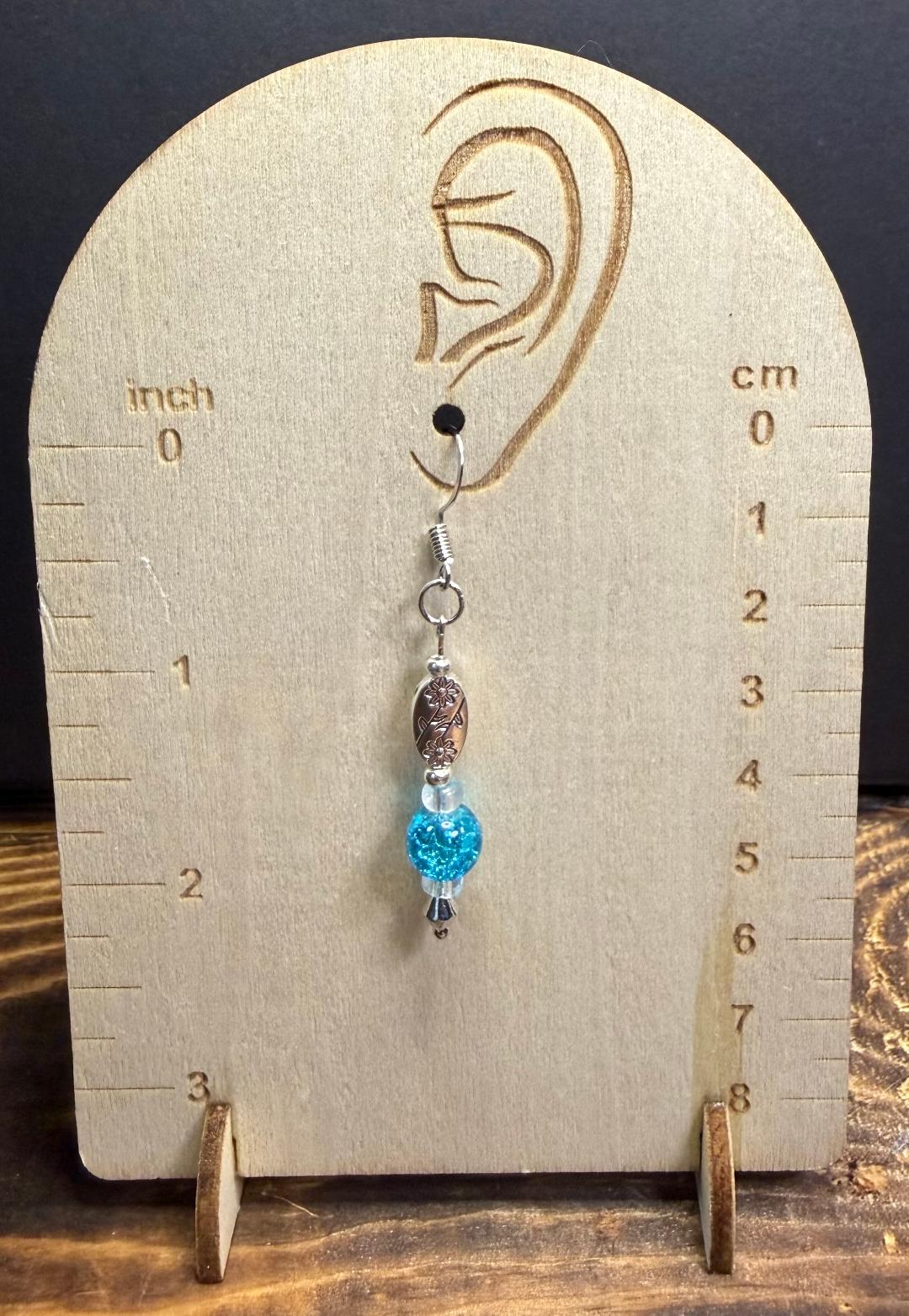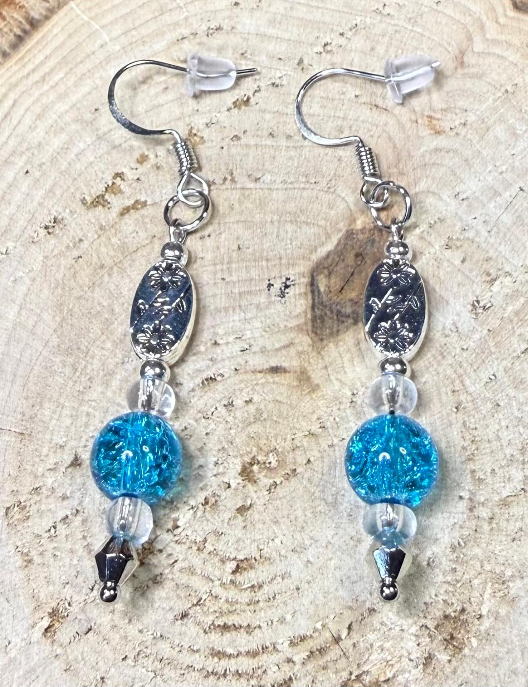 NEW AQUA BLUE GLASS BEAD & FLOWER ETCHED BEAD EARRINGS