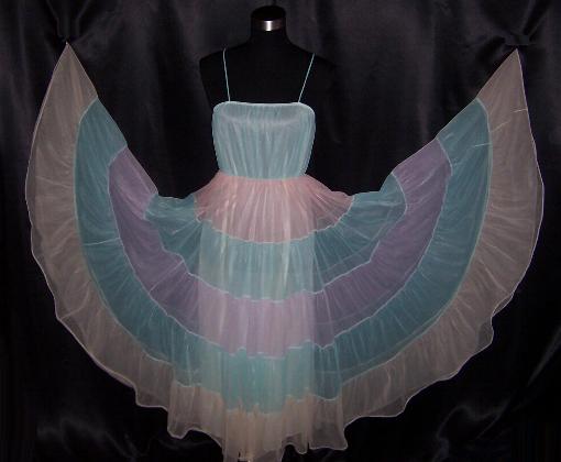 ![]() | Item #: 1000500 Click on image to see more pictures! Quite unusual with an array of pastels; pink, green, blue, peach and lilac with a graduated ruffle tier and spaghetti straps. Circa 1970's, tagged Vanity Fair size small, it will fit a bust size of anywhere from 26-36 comfortably, waist has a stretch of up to 38, length is 47 inches and the sweep is over 150 inches! In excellent condition - I cannot find any noticeable wear or flaws! Measurement Questions? Price: 95.00 |