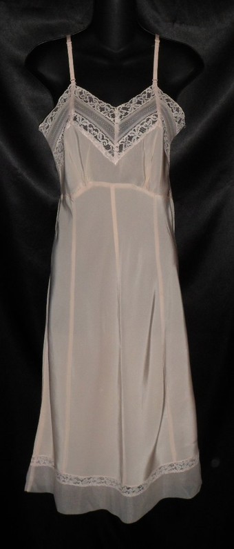 | Item #: 1002338 Click on image to see more pictures! So lovely with that signature rayon sheen, lace decorated bodice, sheer chiffon hemline topped with a strip of lace. There are triple seams in the front and back, very unique. I have made a few repairs to the straps where I had to re-attach them to the slip, a few seams might need a stitch or two to tighten them up, too. I don't see a tag so I don't know the maker. The bust will fit 32, waist 29", hips 40", length is 43", really pretty and the condition is really nice. Measurement Questions? Price: 45.00 |