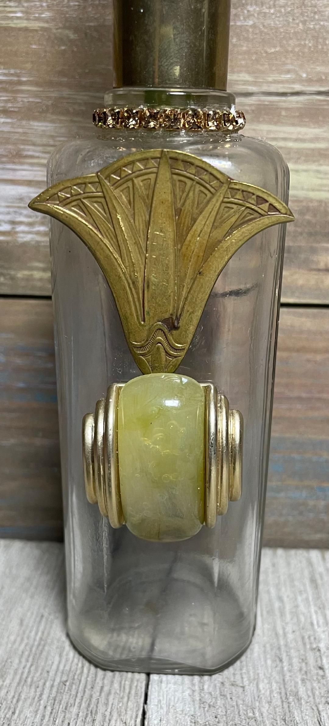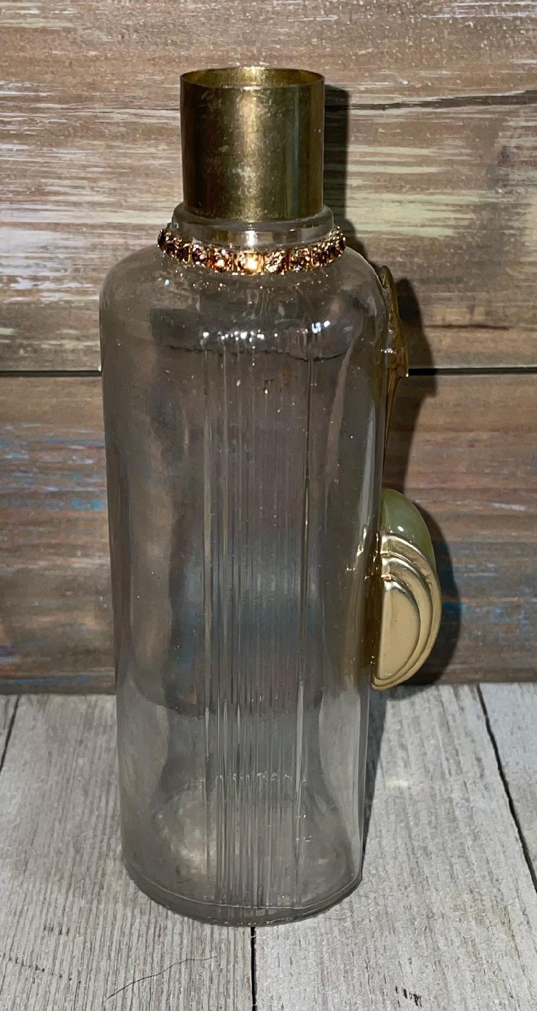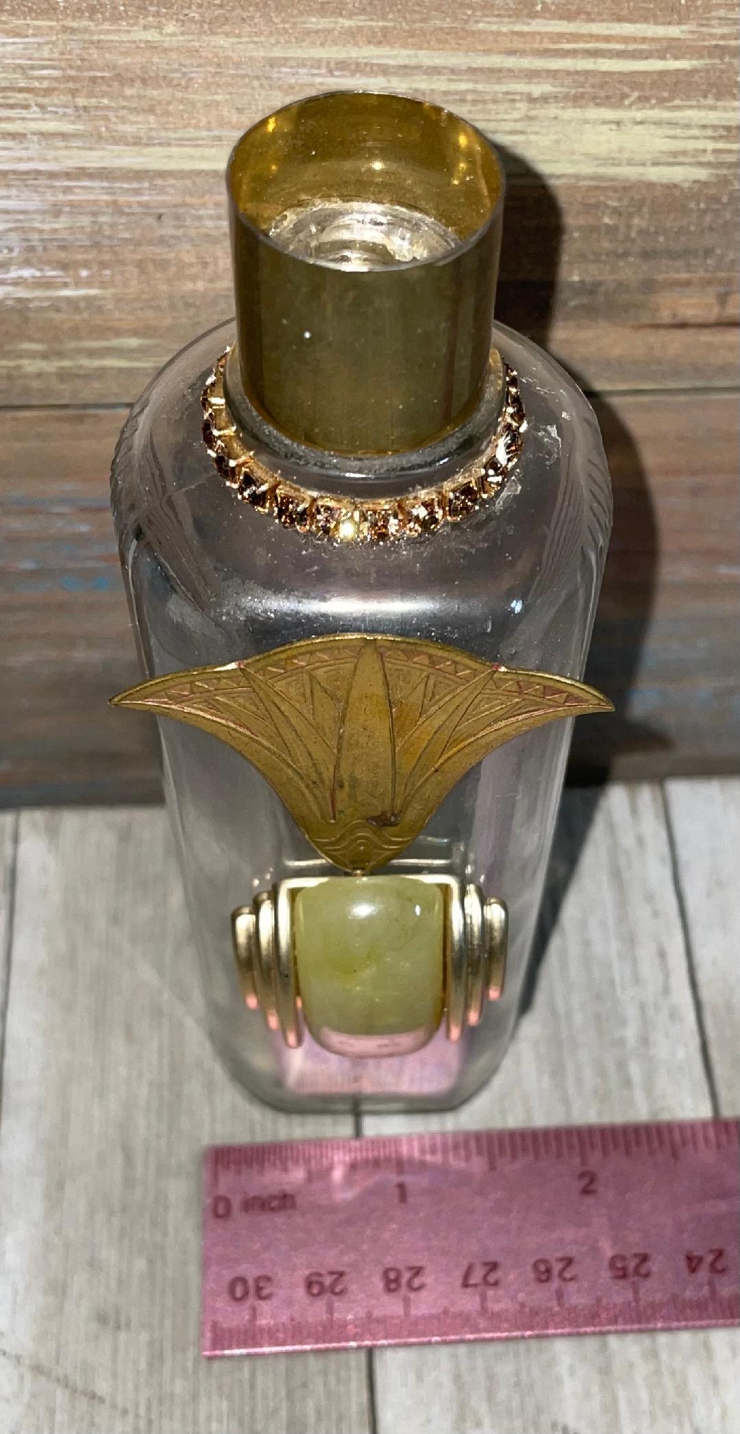 ![]() | Item #: 1005104 Click on image to see more pictures! This was so interesting that I had to offer it up on Etsy. It appears that someone turned an old bottle into an Art Deco (or Art Nouveau) table top piece. It may have once been a perfume bottle, but the top was missing and they added a string of little faux amber gems around the neck. I'm not sure if the pieces places on the front were original to the bottle, but I'm assuming they were. In any case, they added the little spray of floral and I think it's cute! Take those out and add whatever you like, so many possibilities here! Aged patina on the metal, shows lovely signs of the era. Please consider the photos as part of the description and measurements. Measurement Questions? Price: 29.00 |
