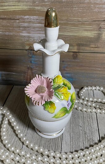 VINTAGE 1950'S RAISED FLOWER GOLD GILDED VICTORIAN STYLE LIDDED PERFUME BOTTLE
