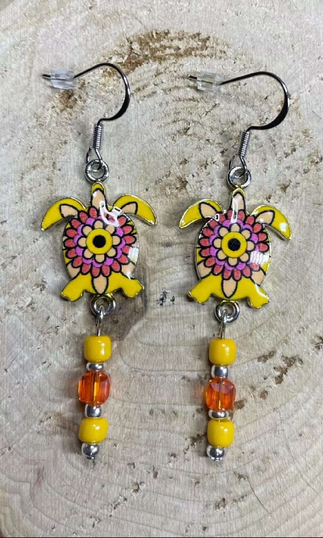 NEW HANDMADE BOHO HIPPIE YELLOW ENAMEL SEA TURTLE CHARM & BEADED EARRINGS