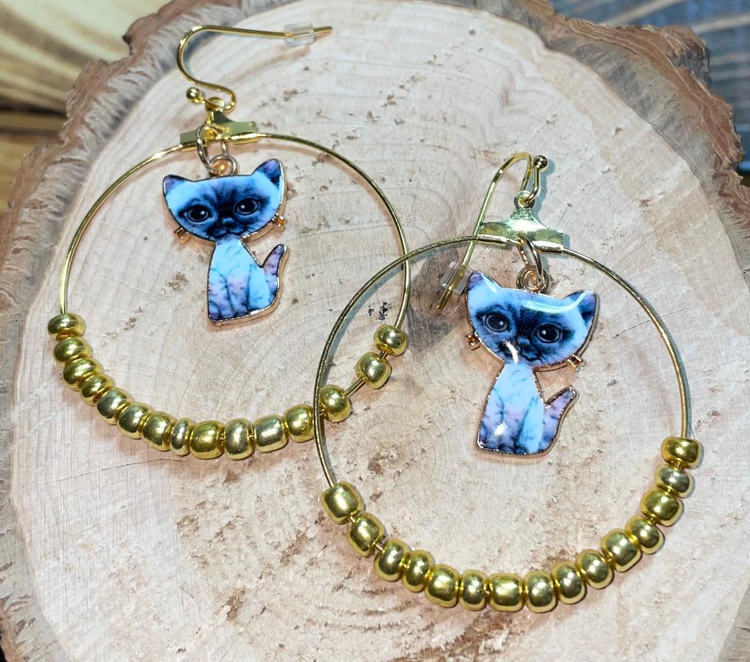 NEW GOLD TONE HOOP EARRINGS W/ ENAMEL KITTY CAT & BEADING