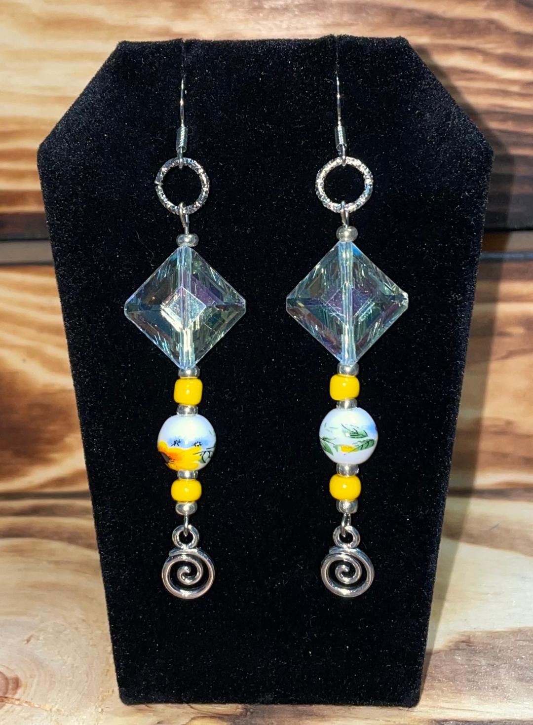 ![]() | Item #: 1005441 Click on image to see more pictures! This pair is a unique combination of beading, consisting of yellow, white with flowers, one iridescent diamond shape bead and a silver tone swirl at the bottom. They are longer style, very pretty. They are made with nickel free earring hooks. Please see photos for measurements - guaranteed unique and assembled with love. Measurement Questions? Price: 20.00 |