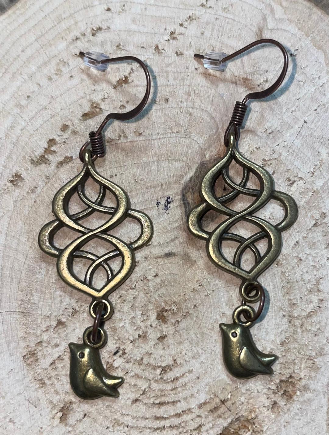 ![]() | Item #: 1005548 Click on image to see more pictures! A drop earring in bronze alloy metal, consisting of a tiny bird that is topped with a lattice swirl style extender. Please see photos for measurements - guaranteed unique and assembled with love. Measurement Questions? Price: 14.00 |