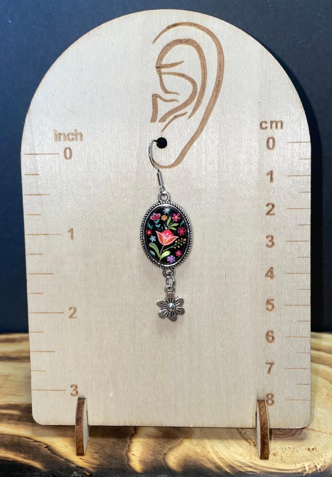 ![]() | Item #: 1005549 Click on image to see more pictures! A lovely and romantic pair of earrings consisting of a colorful oval pendant featuring a floral bouquet, with a silver flower dangling below. The hooks are nickel free, new and unique. Please see photo for measurements. Measurement Questions? Price: 15.00 |