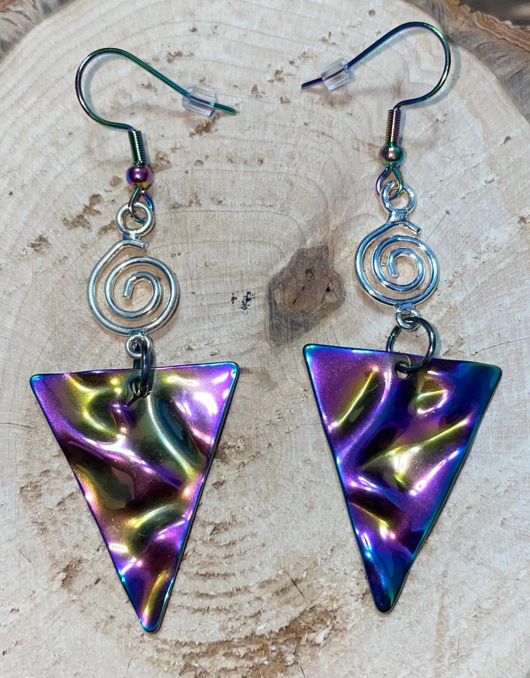 ![]() | Item #: 1005569 Click on image to see more pictures! Made with stainless steel in a geometric triangle shape, with a gorgeous iridescent rainbow sheen, topped with a small alloy metal swirl charm. They have nickel free hooks; please see photo for measurements. Measurement Questions? Price: 18.00 |