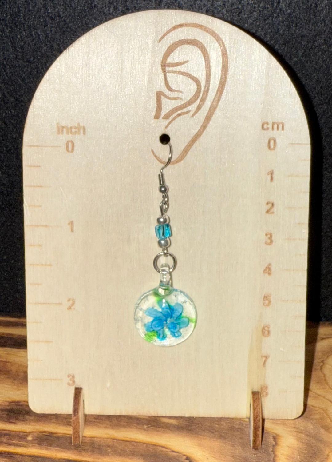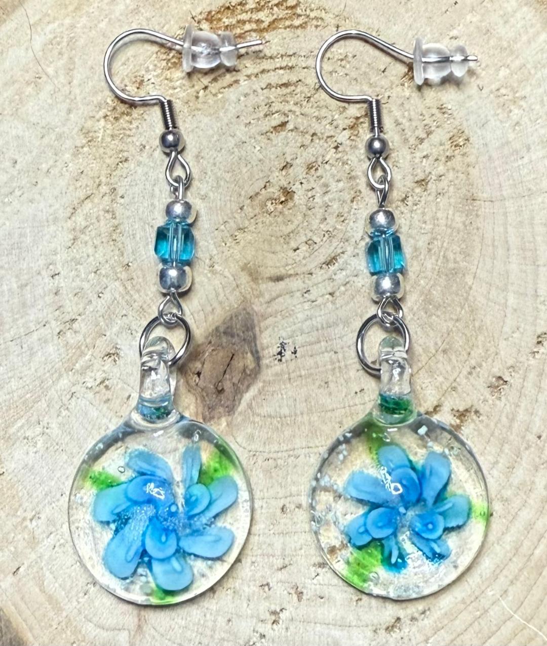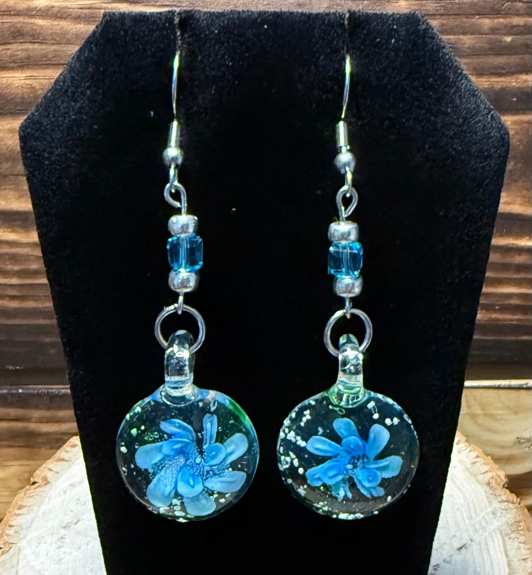 ![]() | Item #: 1005877 Click on image to see more pictures! Inspired by elegant Murano glass, this pair has faux teal flowers inside. There are added teal glass cube beads and tiny silver round beads as well. Made with nickel free earring hooks. Measurement Questions? Price: 18.00 |
