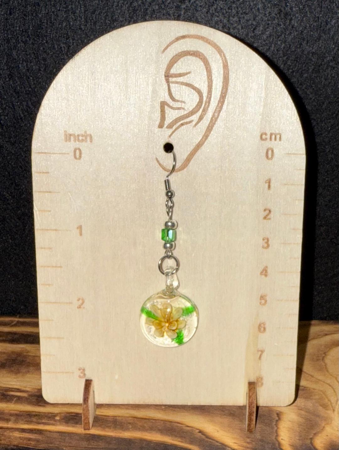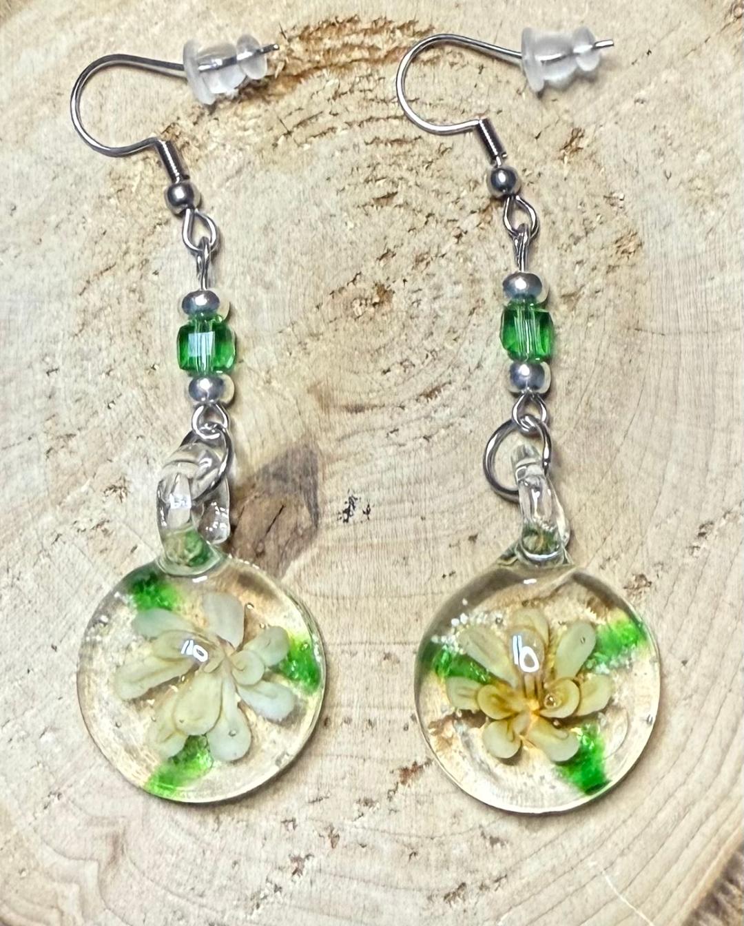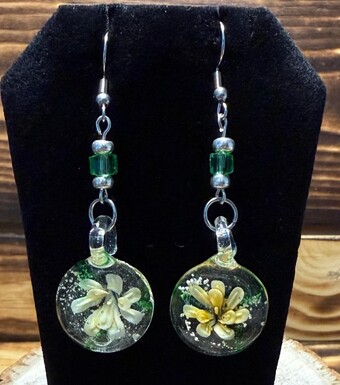 ![]() | Item #: 1005881 Click on image to see more pictures! Inspired by elegant Murano glass, this pair has faux yellow flowers inside. There are added green glass cube beads and tiny silver round beads as well. Made with nickel free earring hooks. Measurement Questions? Price: 18.00 |