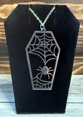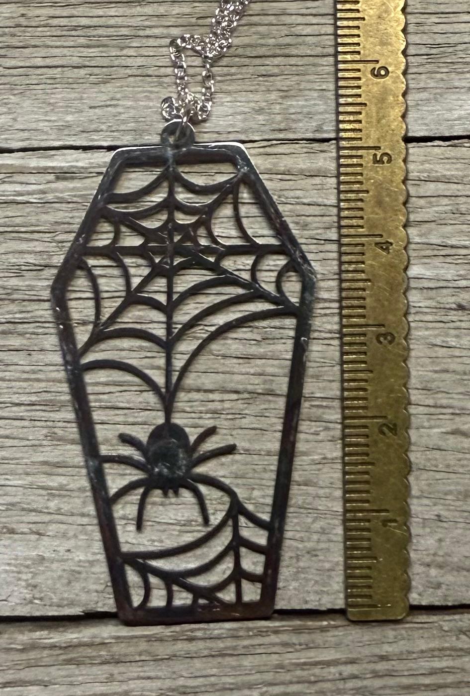 NEW LARGE STAINLESS STEEL COFFIN SPIDER & WEB 16" NECKLACE
