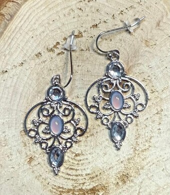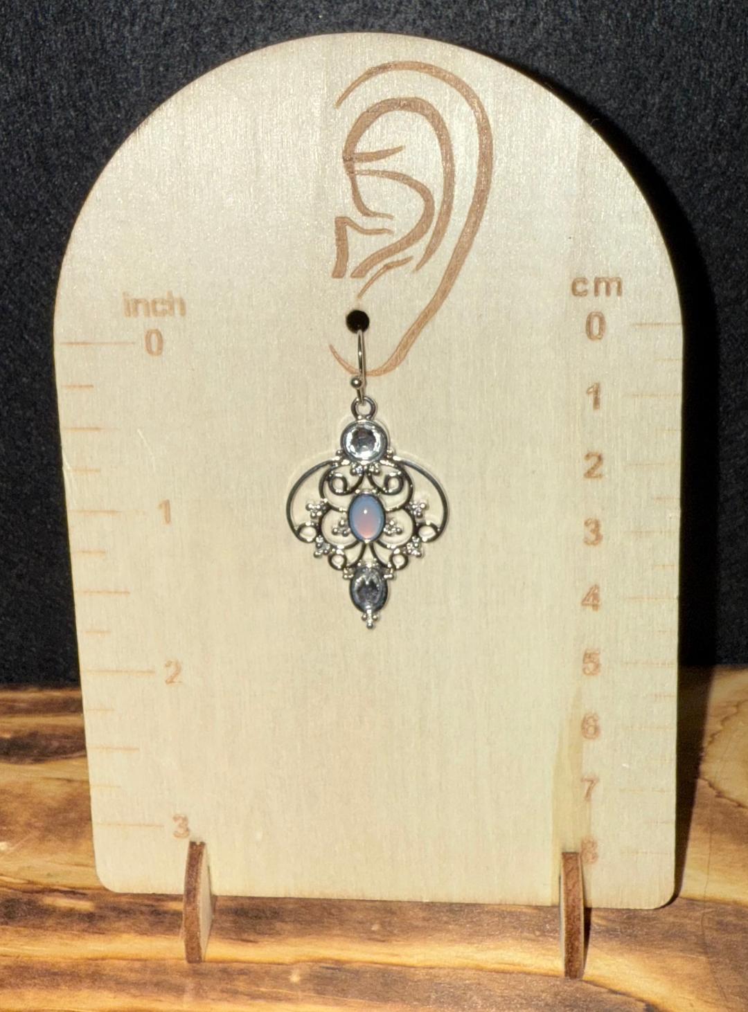 ![]() | Item #: 1005920 Click on image to see more pictures! An attractive pair of French retro style earrings in silver alloy with 2 clear rhinestones on the top and bottom and a faux opal style gem in the center. They are made with nickel free hooks. Measurement Questions? Price: 12.00 |