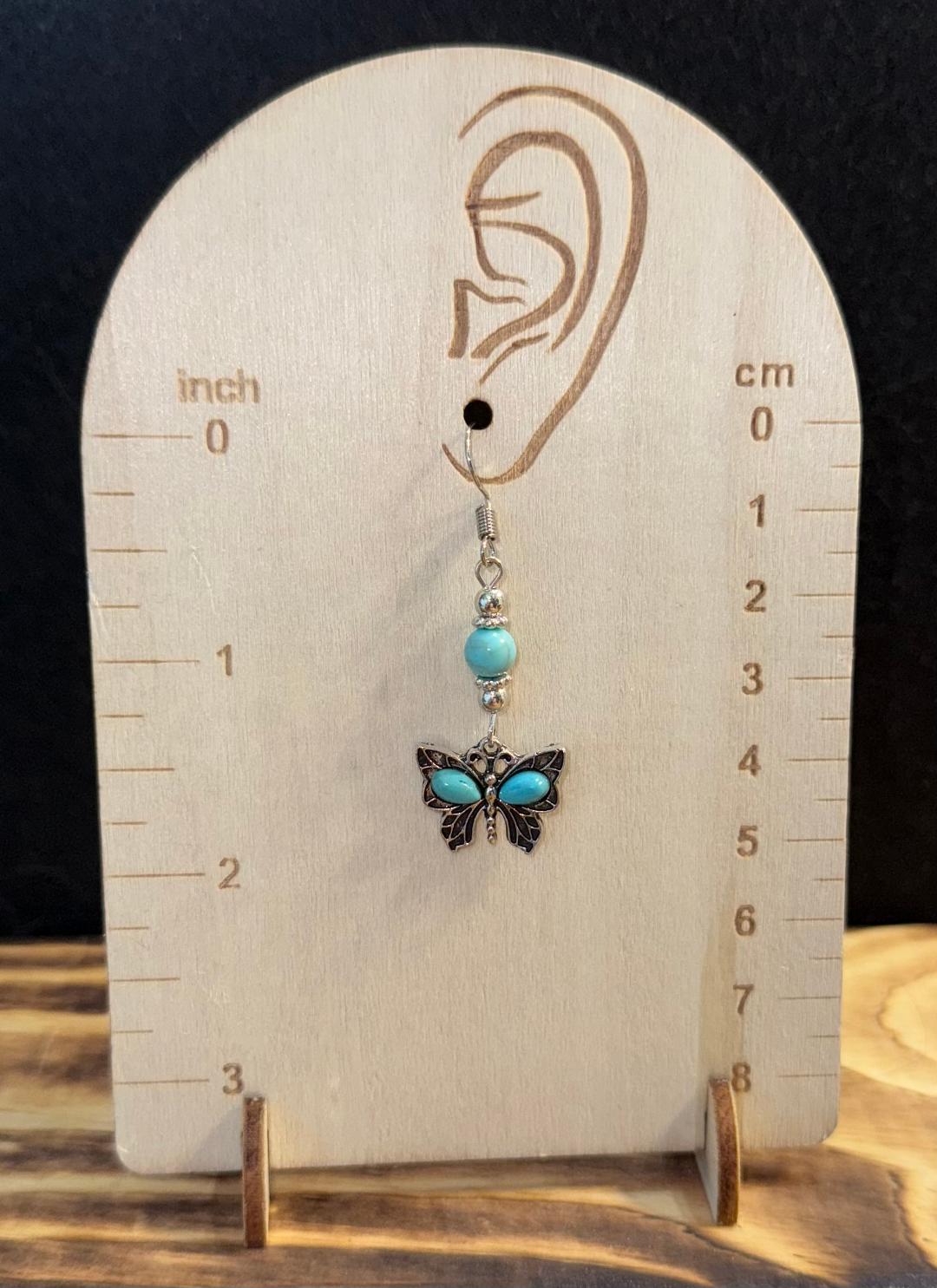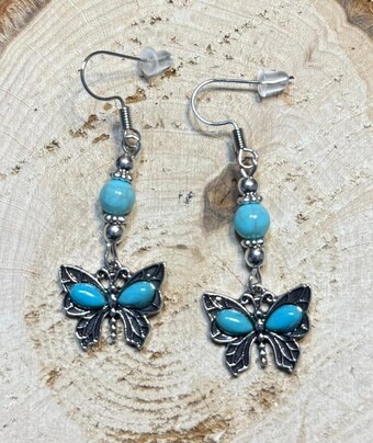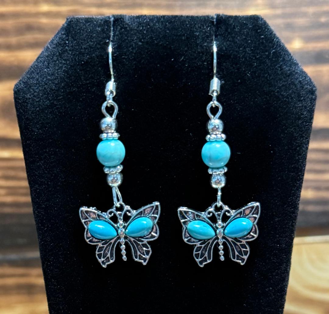 ![]() | Item #: 1005921 Click on image to see more pictures! Decorated with faux turquoise green gems and beading and a silver alloy butterfly charm. Made with nickel free earring hooks. Measurement Questions? Price: 12.00 |