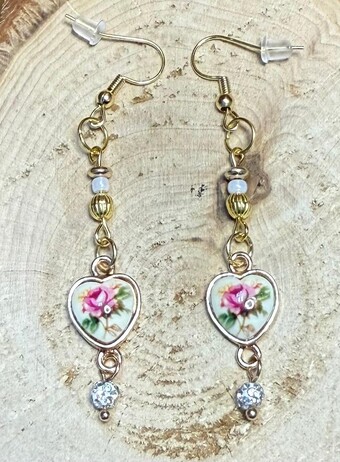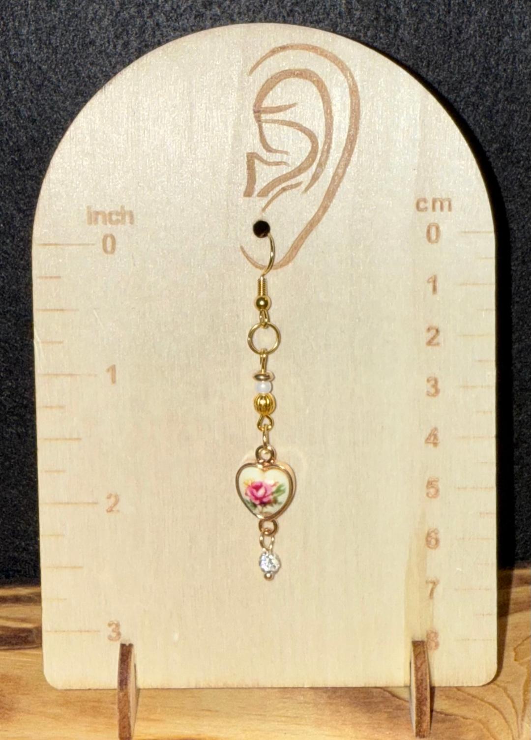 ![]() | Item #: 1005922 Click on image to see more pictures! The focal point is a heart shaped charm decorated with a floral rose flower in the center. There is a dangling white bead studded with clear rhinestones for extra sparkle. Just below the earring hook there are gold & white beads as well. Made with 18K gold plated, nickel free earring hooks. Measurement Questions? Price: 15.00 |
