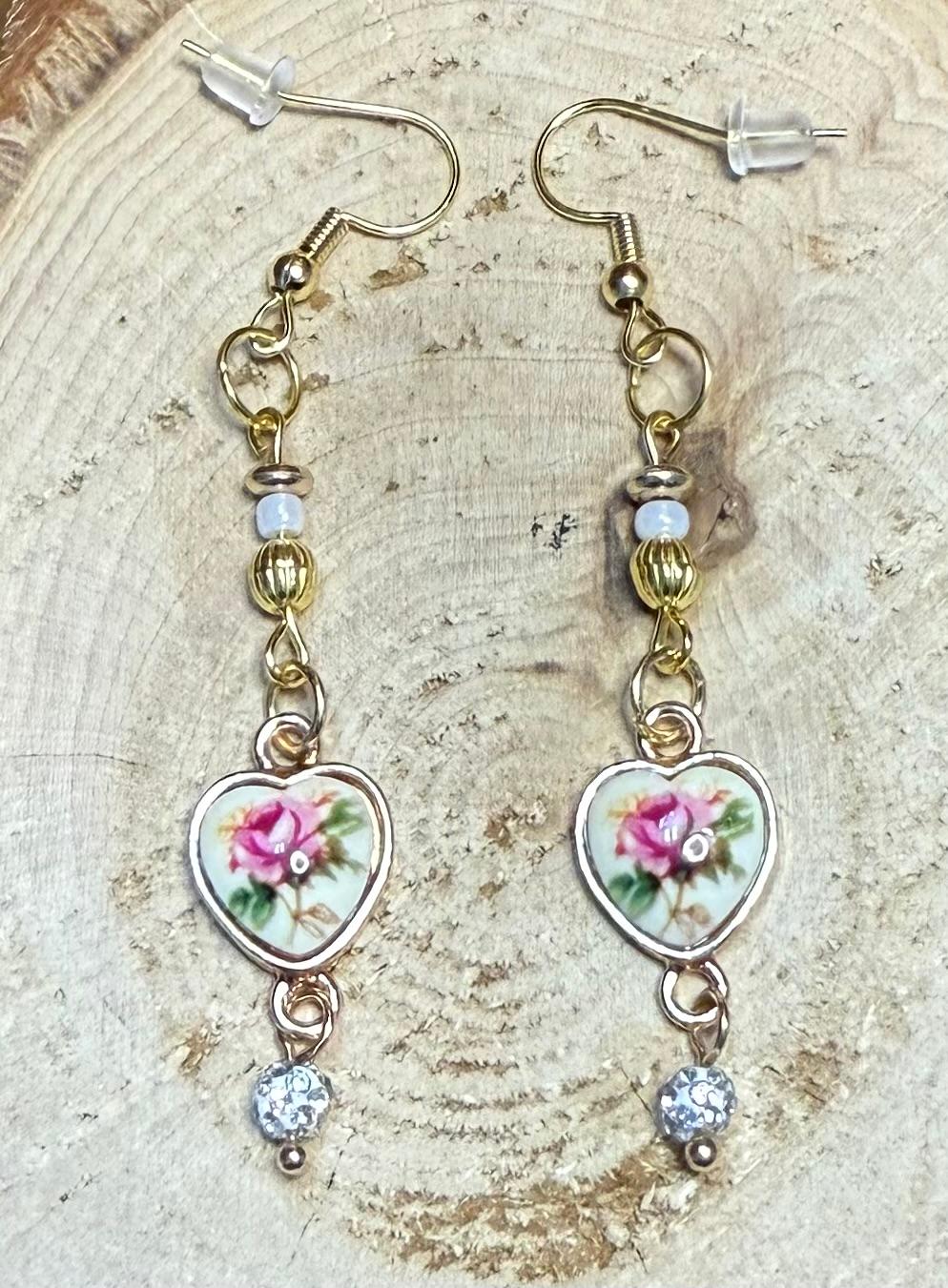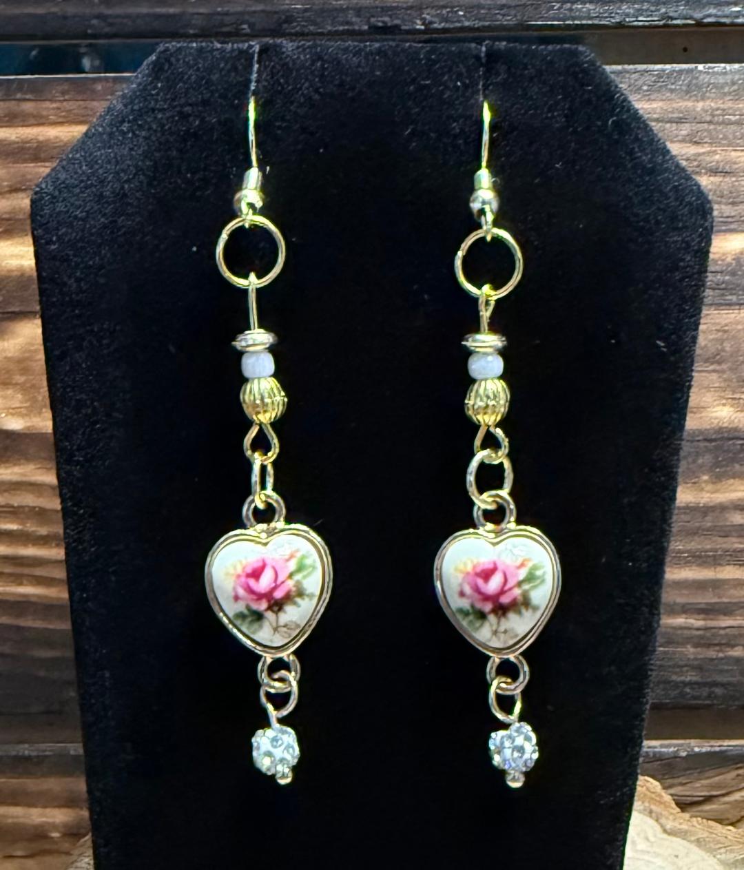NEW ROMANTIC HEART ROSE CHARM DANGLE EARRINGS W/ RHINESTONE COVERED BEADS