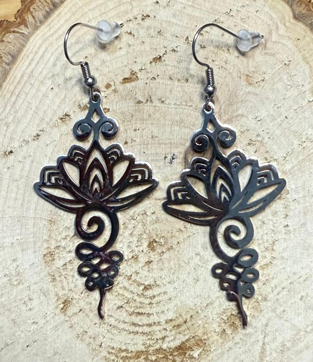 NEW DRAMATIC SILVER STAINLESS STEEL LOTUS CHARM EARRINGS