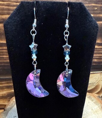 ![]() | Item #: 1005929 Click on image to see more pictures! Made from purple/blue faceted glass moon charms, with added silver stars and blue & silver faceted small beads above. The moon charms are coated silver on the back. Made with nickel free earring hooks. Measurement Questions? Price: 16.00 |